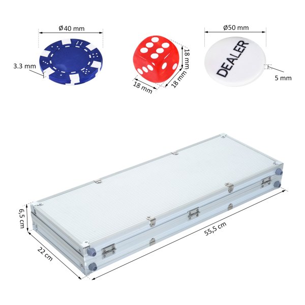 - Afmetingen per pokerchip: Ć40 x 3,3 mm