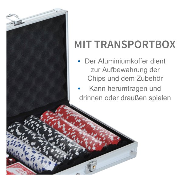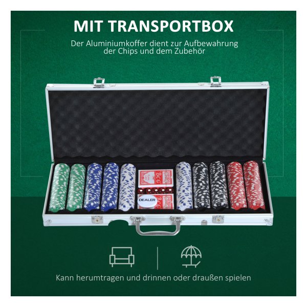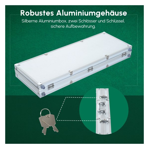 De pokertafelset wordt geleverd in een stevige aluminium koffer met afsluitbare gespen, inclusief 2 sleutels. Dit maakt het eenvoudig om de set veilig op te bergen en mee te nemen naar vrienden of familie voor een gezellig avondje pokeren.