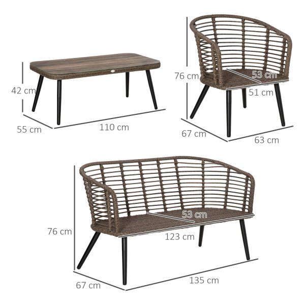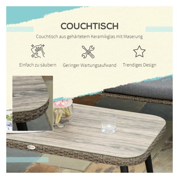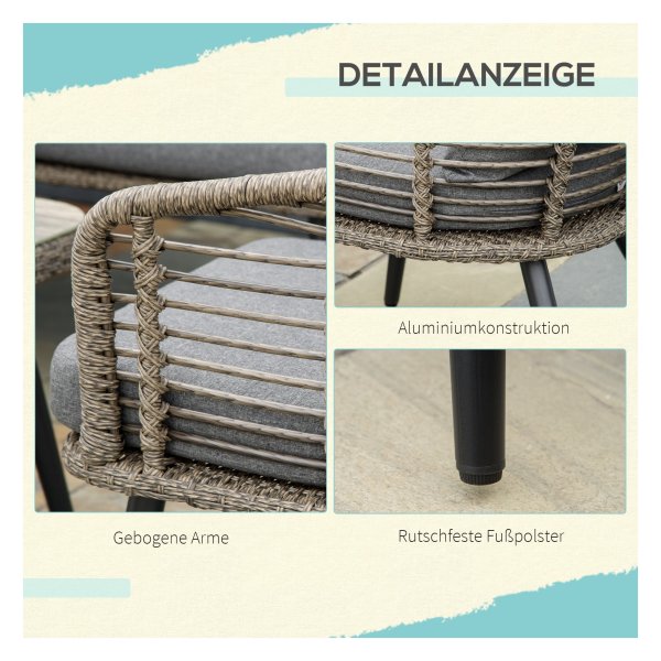 De kleurencombinatie van bruin en grijs geeft de set een moderne uitstraling die bij elke buitenruimte past. Het materiaal bestaat uit staal, poly rattan, polyester en gehard glas voor duurzaamheid en stevigheid.
