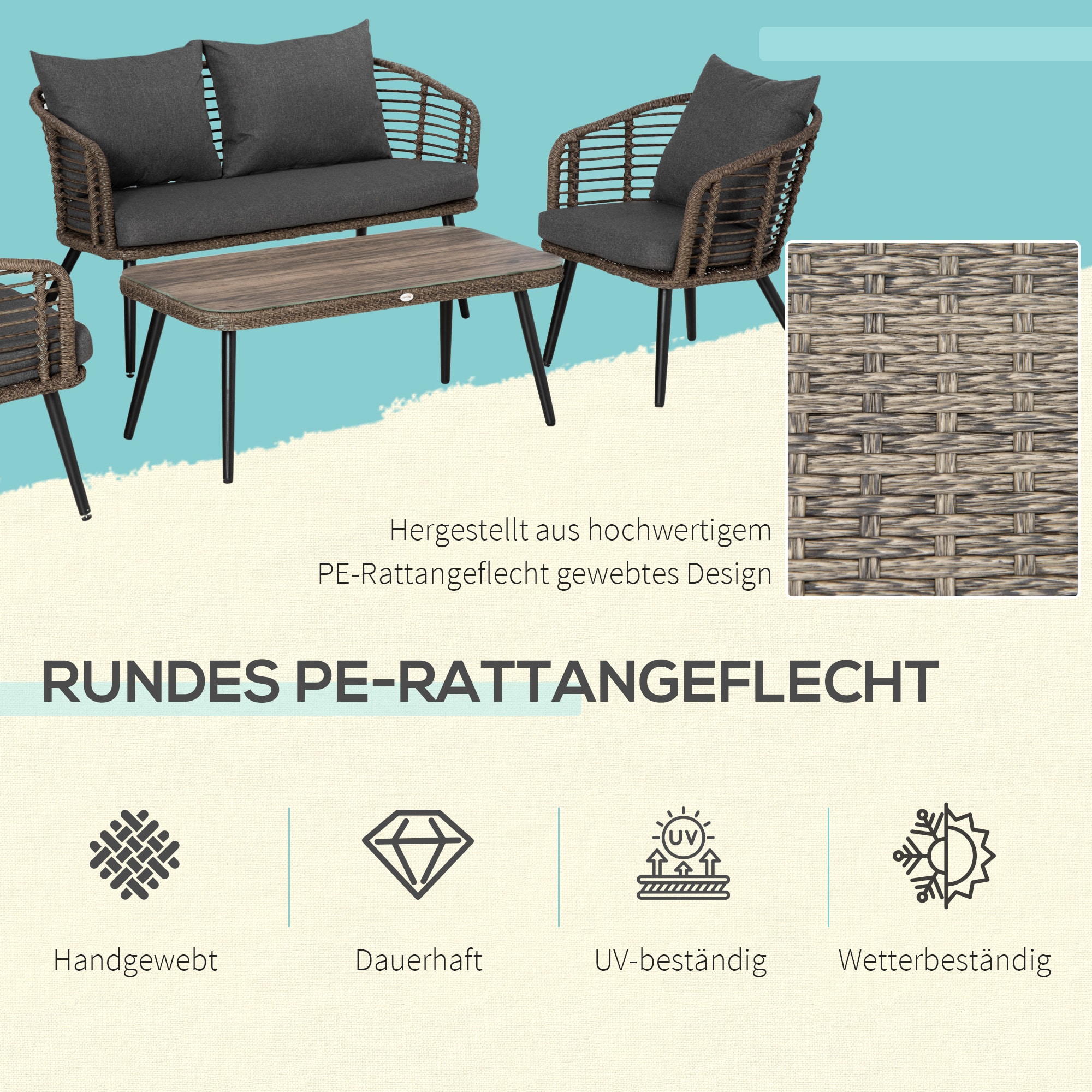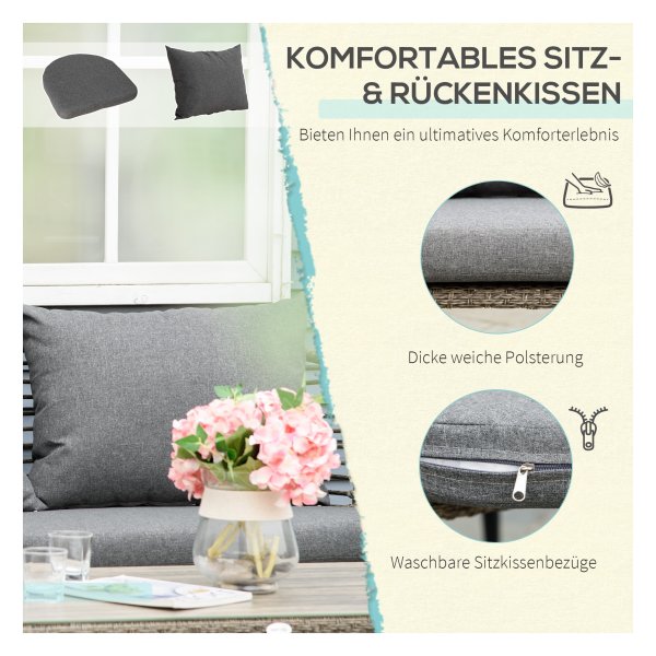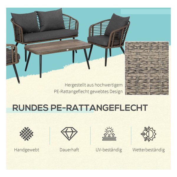 Deze prachtige loungeset van hoogwaardig poly rattan is ontworpen voor 4 personen en is perfect voor ontspanning in de buitenlucht. Met een natuurlijke bruin/grijze uitstraling past dit terrasmeubilair perfect bij elke tuin, veranda of patio.