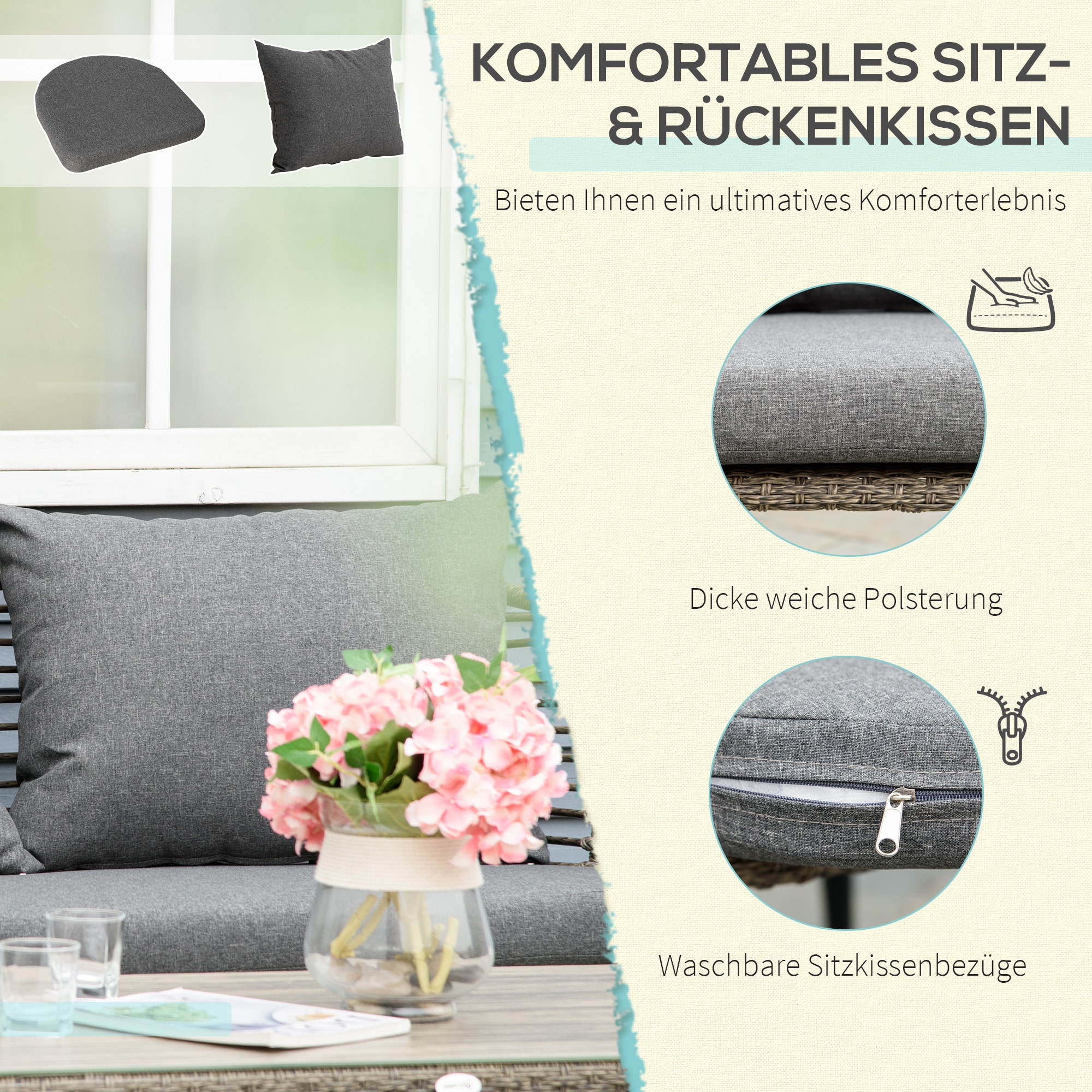 - Zachte bankkussens en rugkussens zorgen voor maximaal comfort tijdens het loungen.