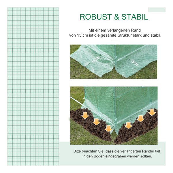 - De 15 cm uitgestrekte randen van de folie dienen diep in de grond te worden begraven voor maximale stabiliteit en bescherming.