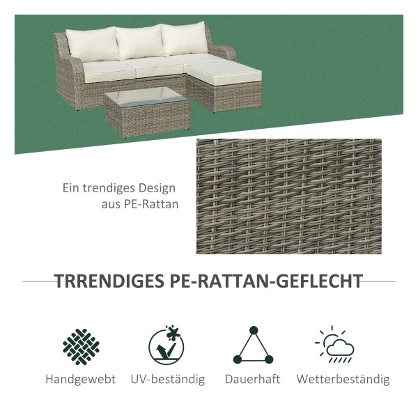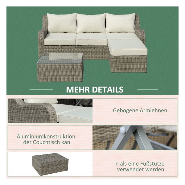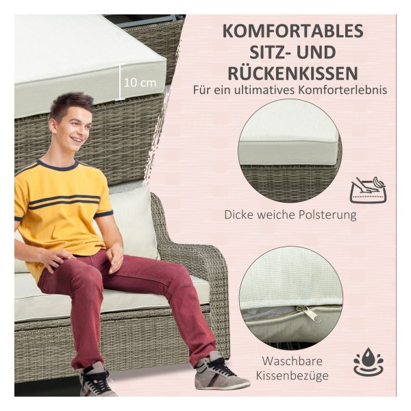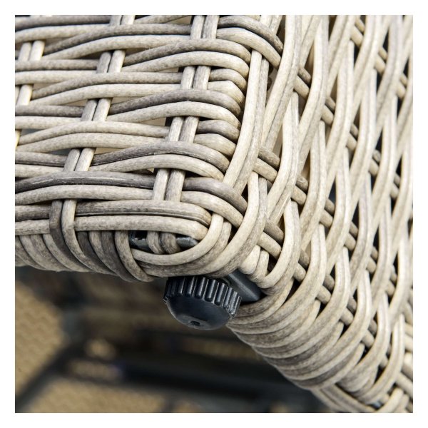 Het aluminium frame van de tuinmeubelset zorgt voor stevigheid en stabiliteit, maar is tegelijkertijd licht van gewicht waardoor je de set eenvoudig kan verplaatsen. Bovendien is het vlechtwerk gemaakt van weerbestendig polyrattan, waardoor de set bestand is tegen verschillende weersomstandigheden en ideaal is voor permanent buitengebruik.