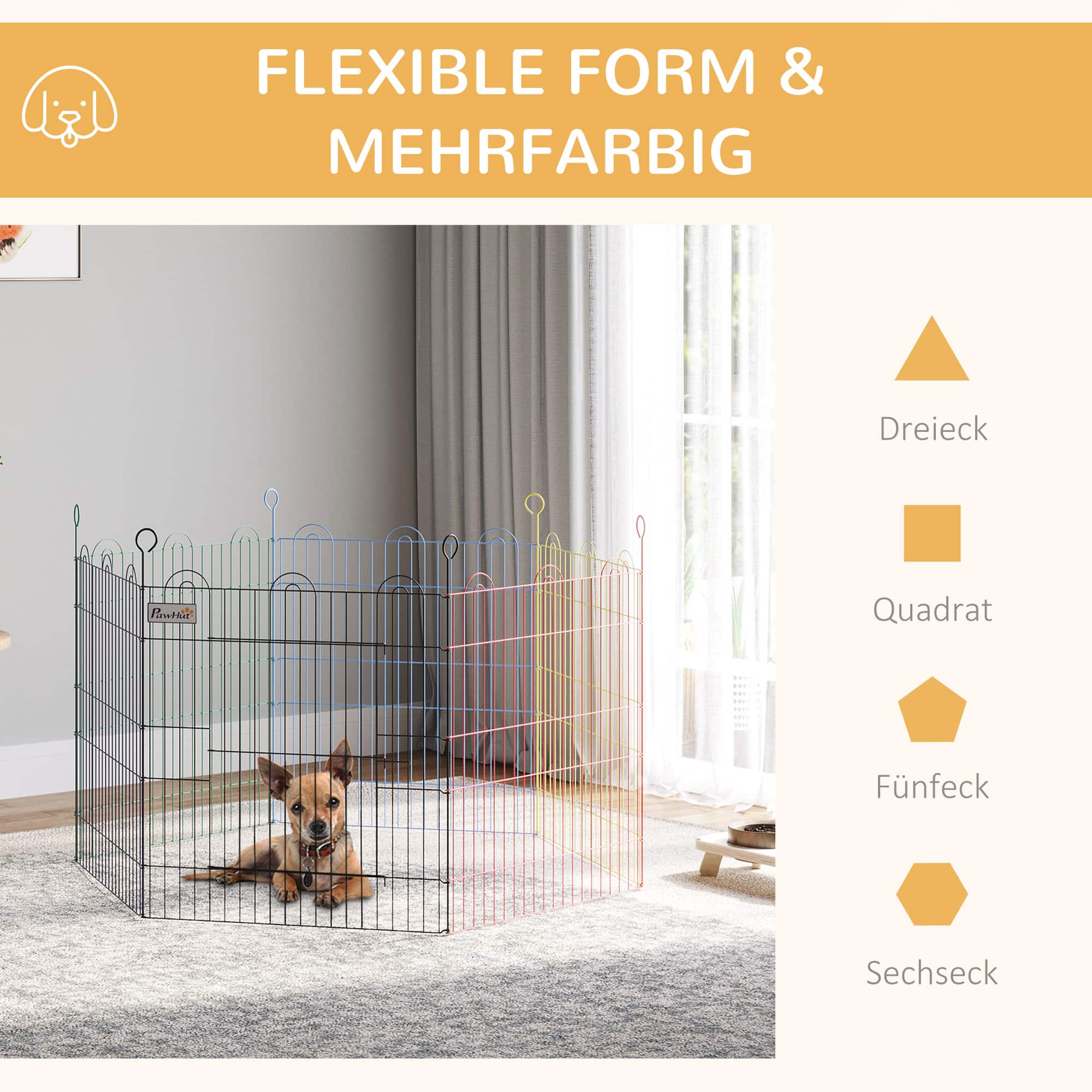 De puppyren kan in verschillende vormen worden opgezet, zoals zeshoek, pentagon, vierkant of driehoek. De mogelijkheden zijn eindeloos en u kunt de indeling aanpassen aan de beschikbare ruimte en de behoeften van uw puppy. Met de inbegrepen haringen kunt u het hekwerk stevig aan de grond bevestigen voor extra stabiliteit.
