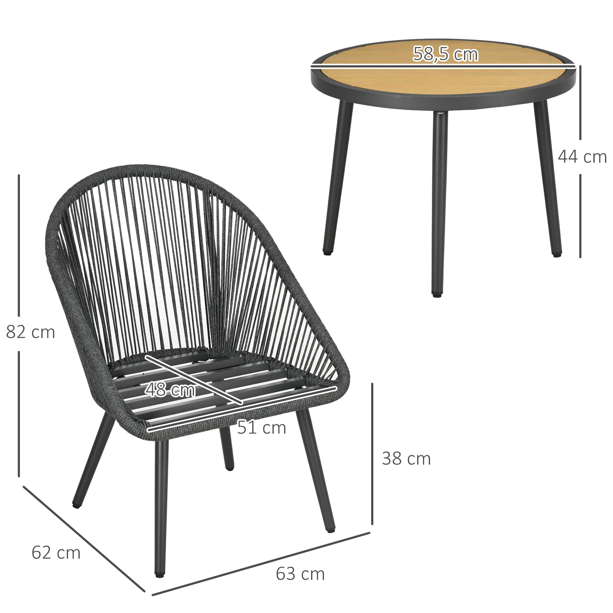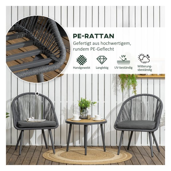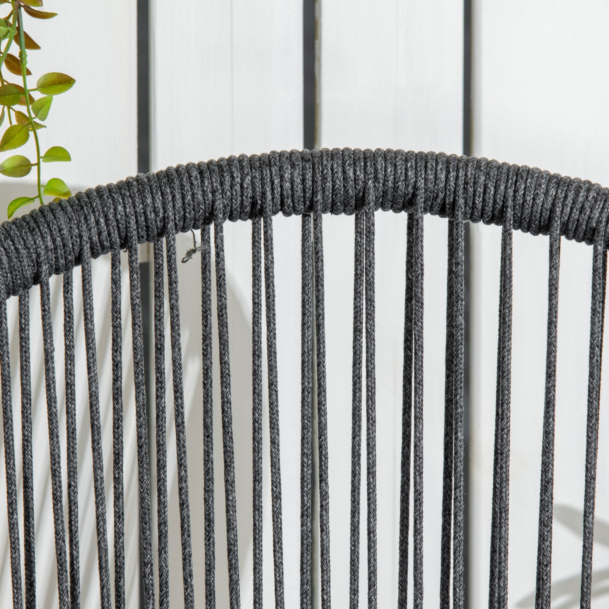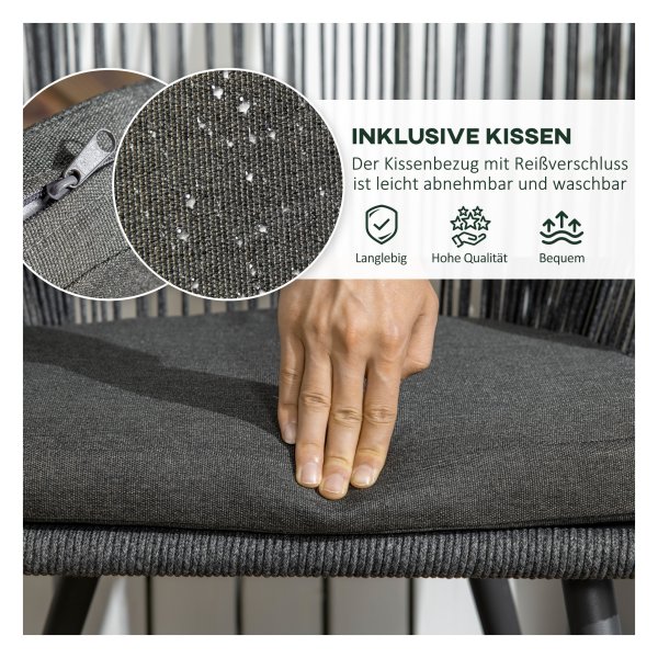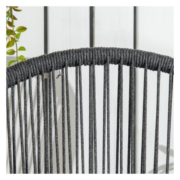 De donkergrijze kleur van het PE-touw en de bijpassende kussens geven een moderne uitstraling aan je buitenruimte. Of het nu op je balkon, terras, bij het zwembad of in de tuin is, deze set past perfect bij elke omgeving.