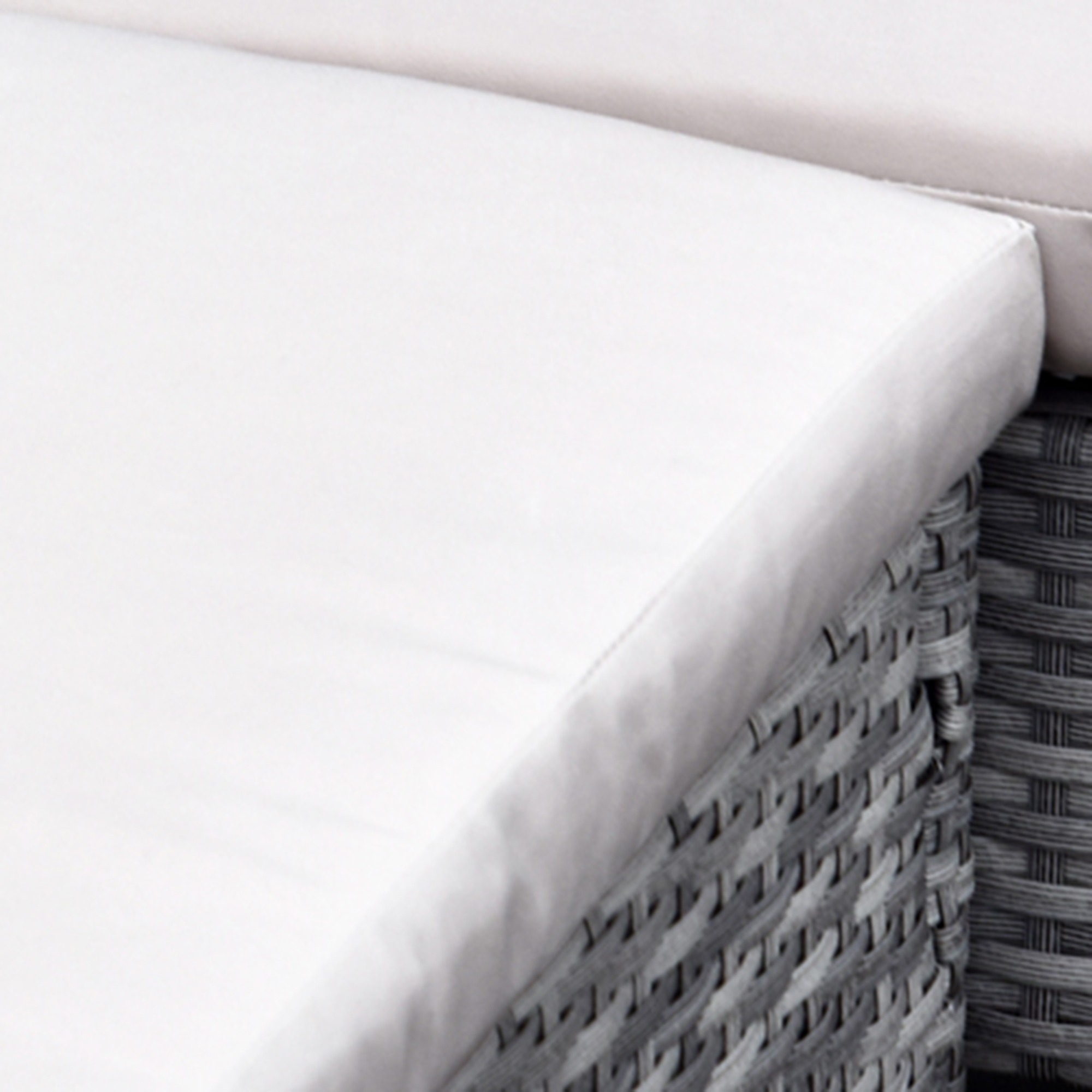 De Tuinmeubelset – LuxeLife is gemaakt van hoogwaardig PE-Rattan, stevig metaal, polyester, schuim en gehard glas. De afmetingen van de meubelstukken zijn als volgt: