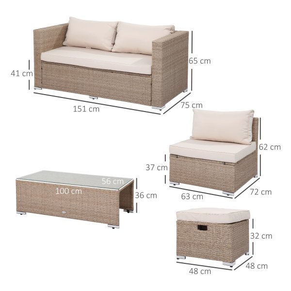 Het frame van de tweezitter heeft een afmeting van L151 x B75 x H65 cm, terwijl de single-sofa’s L129 x B64 cm meten. De stoelhoogte met kussen is 41 cm en de voetenbanken zijn L48 x B48 x H32 cm groot. De salontafel heeft een afmeting van L100 x B56 x H36 cm.