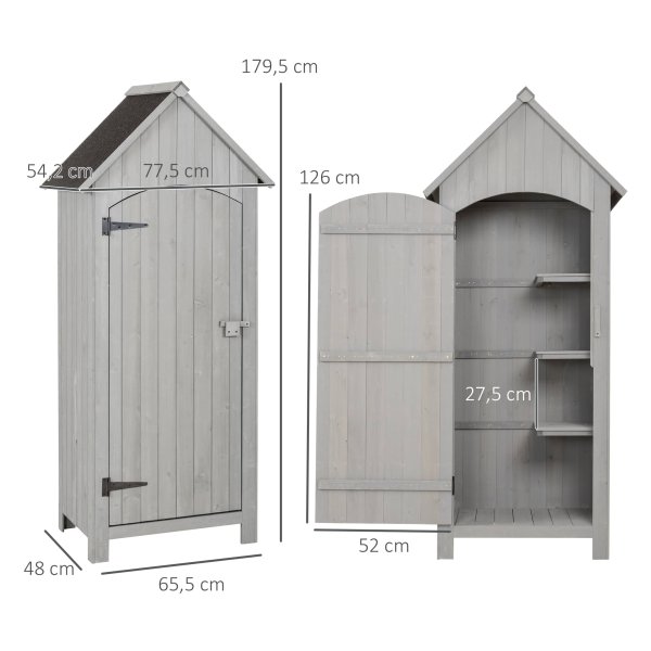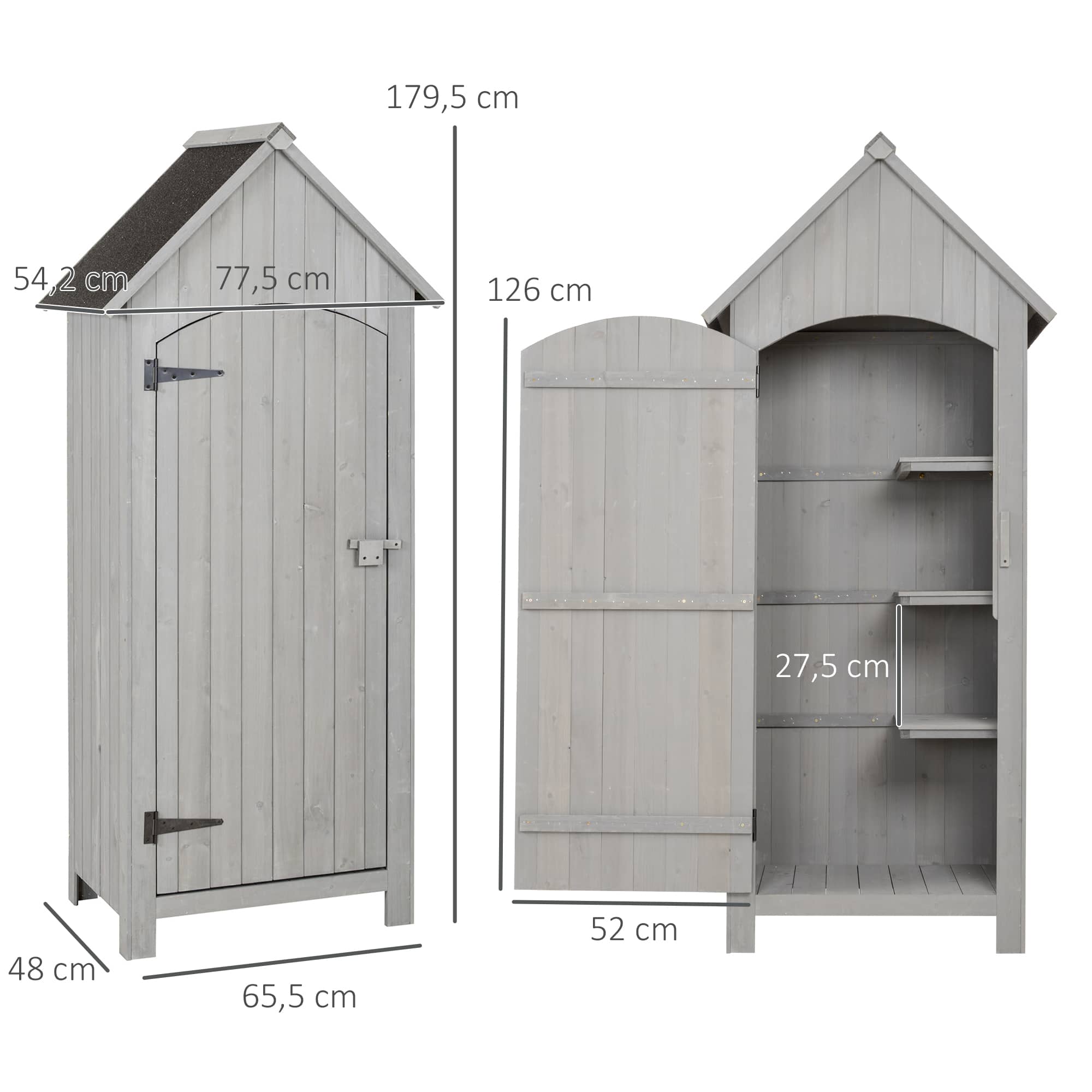 De robuuste tuinschuur heeft een afmeting van 77,5 x 54,2 x 179,5 cm en een ontwerphoogte van 137,5 cm. Het basisoppervlak is 0,3144 m² met afmetingen van 65,5 x 48 cm. De deur heeft een afmeting van 126 x 52 x 1 cm voor gemakkelijke toegang.