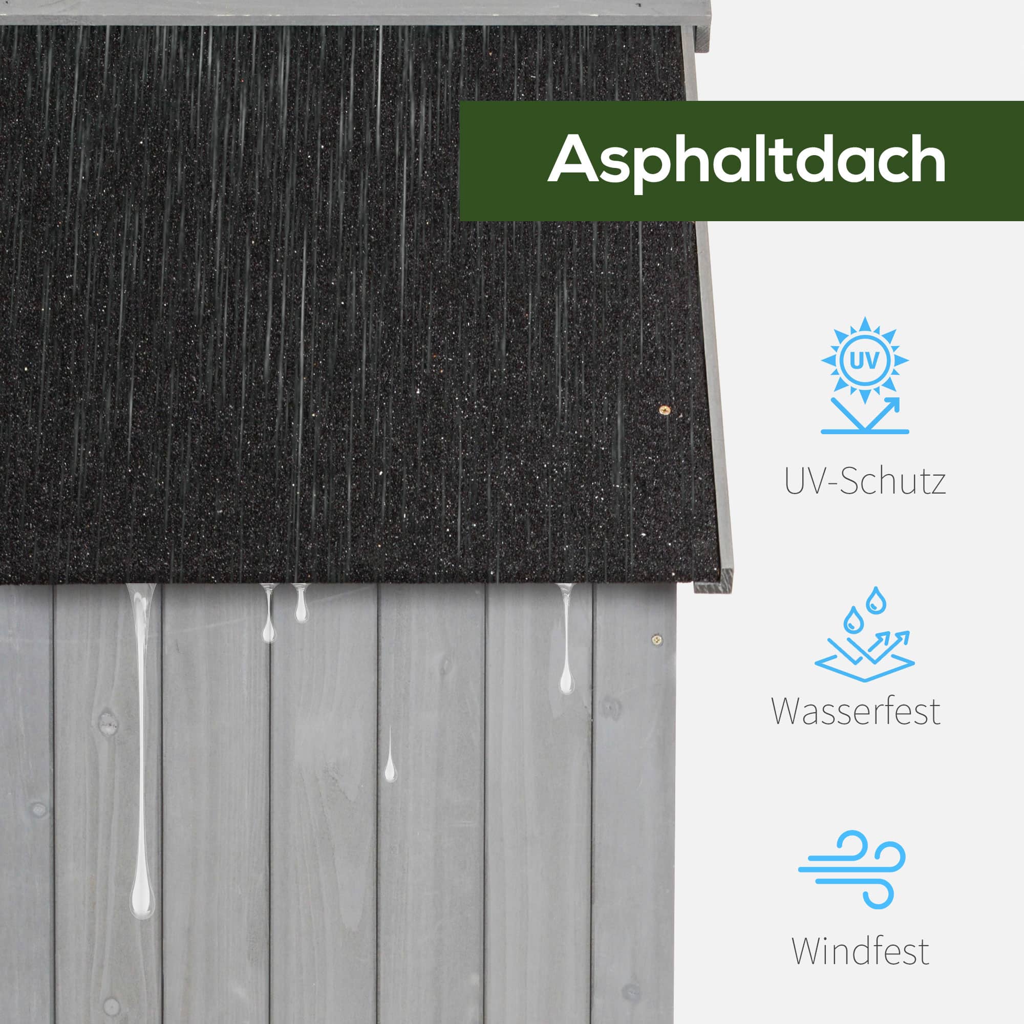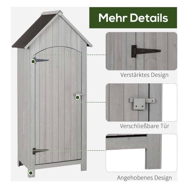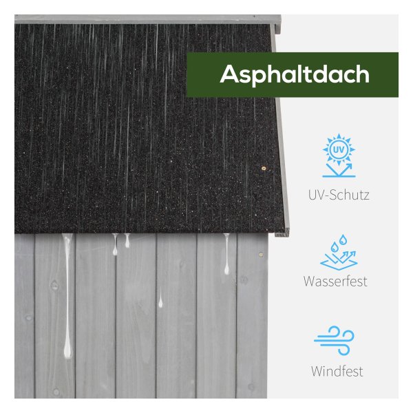 Gemaakt van duurzaam massief FIR-hout en voorzien van een waterdicht bitumen kartonnen dak, beschermt deze tuinschuur uw spullen tegen alle weersomstandigheden. Het giebeldak voorkomt ophoping van neerslag en houdt alles binnen droog, zelfs tijdens hevige regenval.