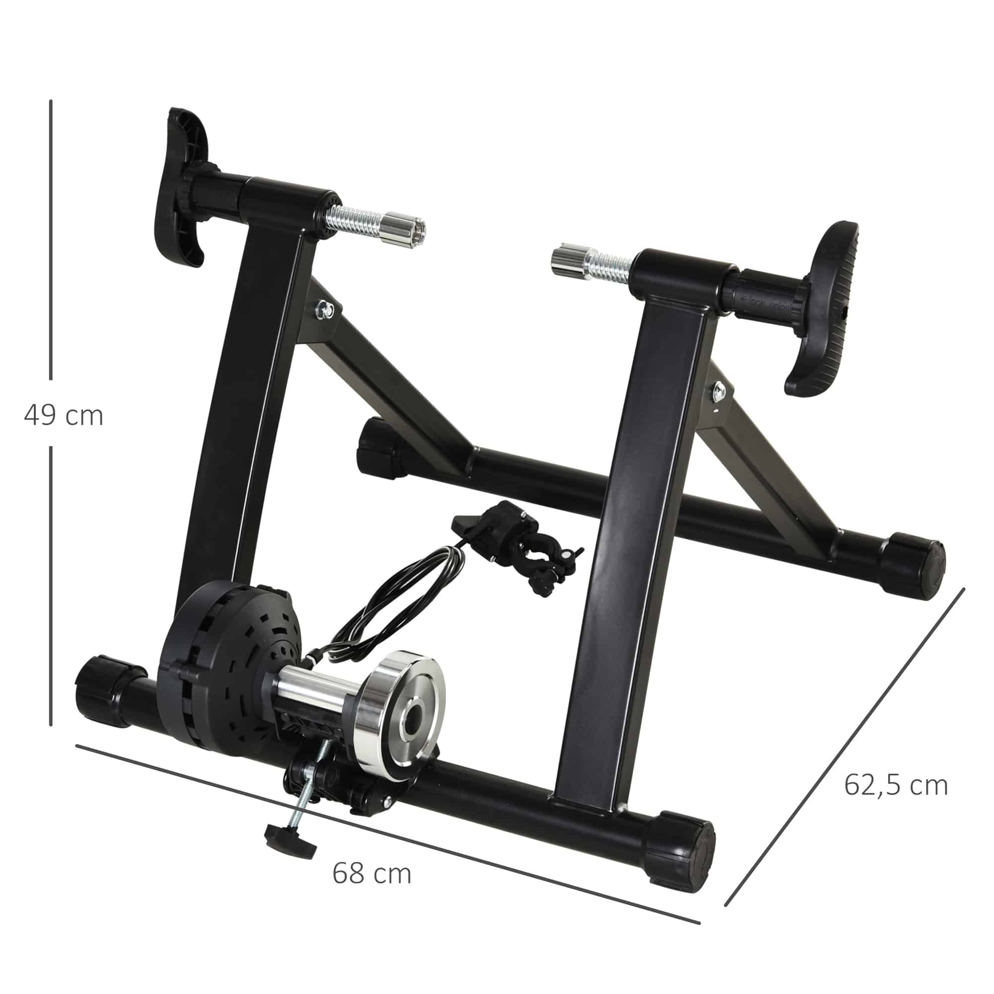 Met afmetingen van 68L x 62.5B x 49H cm en een vouwmaat van 68L x 26B x 49H cm, is deze fietstrainer praktisch en gemakkelijk op te bergen wanneer hij niet in gebruik is. De weerstandsrol heeft afmetingen van 48L x 23B x 1.8T mm, terwijl de fixeerschroef voor de as afmetingen heeft van 28L x 2B x 1.5T mm. De stalen draad is 1900L x Ć2 mm, waardoor deze fietstrainer niet alleen functioneel is, maar ook duurzaam en stevig.
