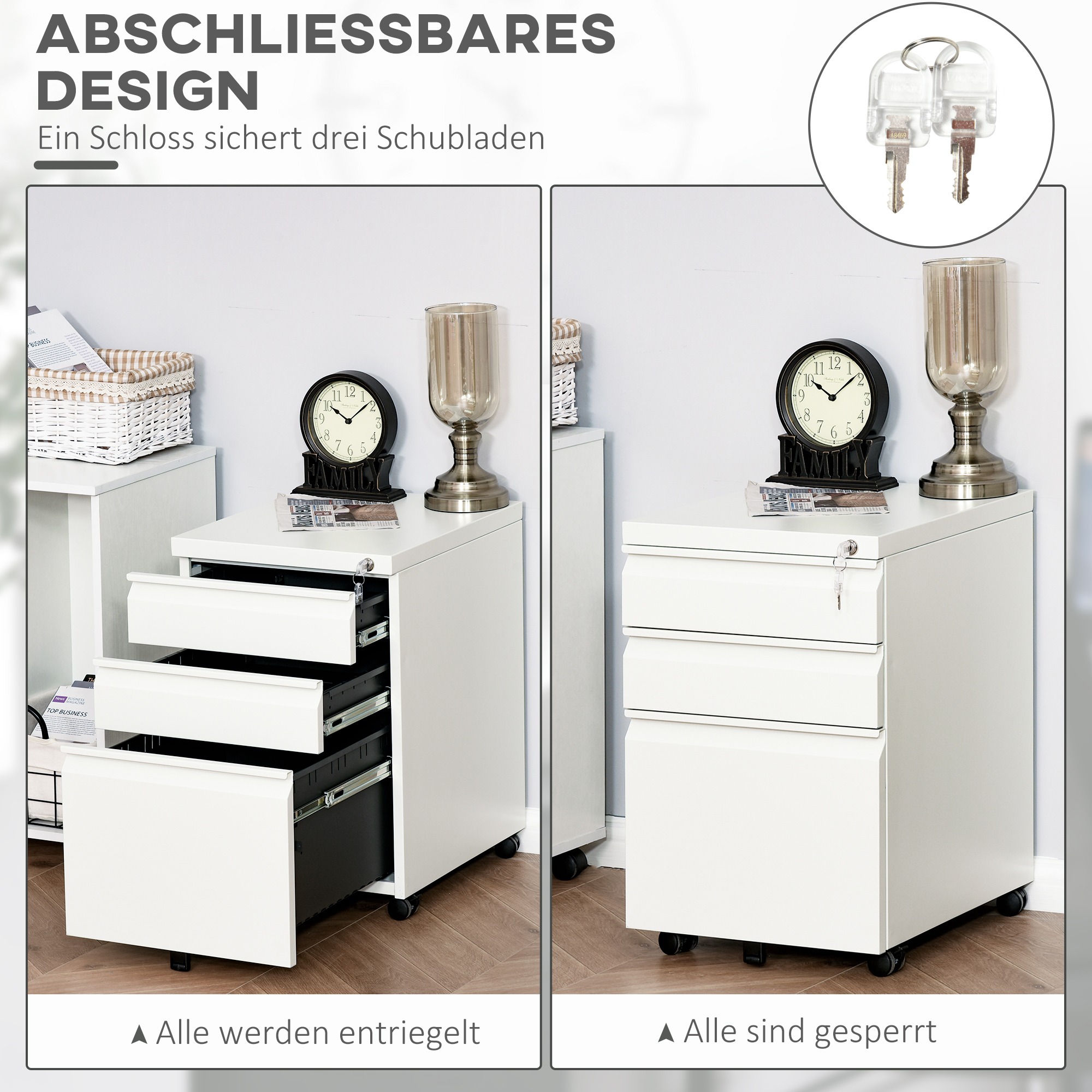 Alle drie de laden van de ladekast kunnen worden vergrendeld, waardoor uw vertrouwelijke documenten veilig opgeborgen kunnen worden. De ladekast is uitgerust met vier multidirectionele wielen, waarvan twee met rem, en een extra wiel als kantelbescherming. Hierdoor kunt u de rolcontainer eenvoudig verplaatsen naar de gewenste locatie in uw kantoor.