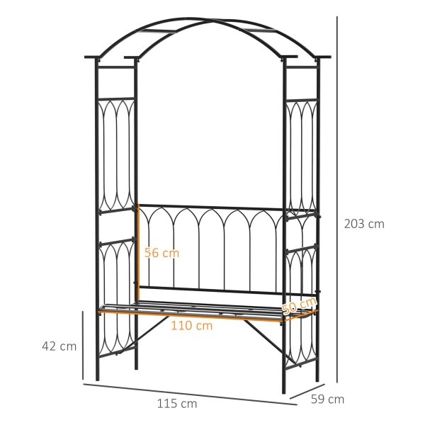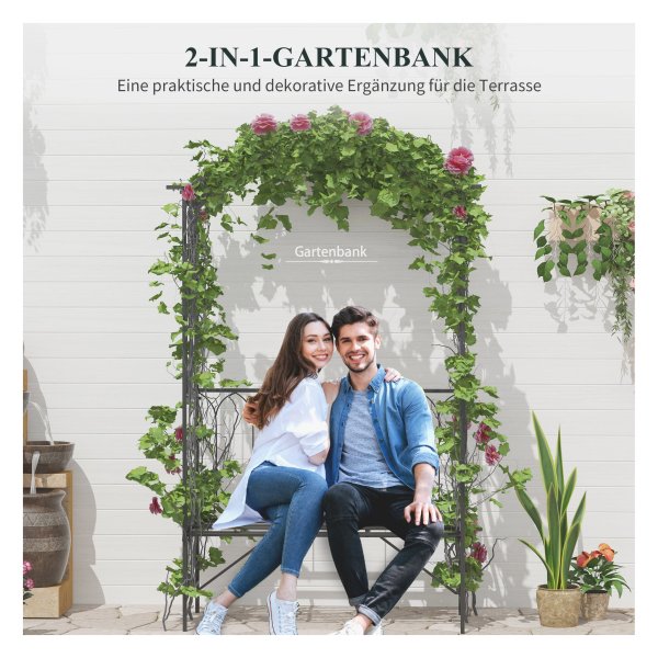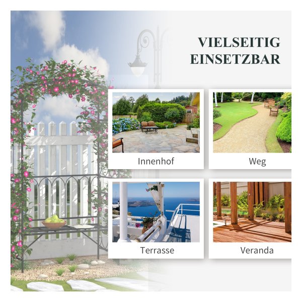 Het gebogen dak van de rozenboog kan worden gebruikt als klimrek voor ranken en planten, waardoor een groene oase ontstaat in uw buitenruimte. De brede bank biedt ruimte aan maximaal twee personen om te ontspannen en te genieten van de natuur om hen heen.