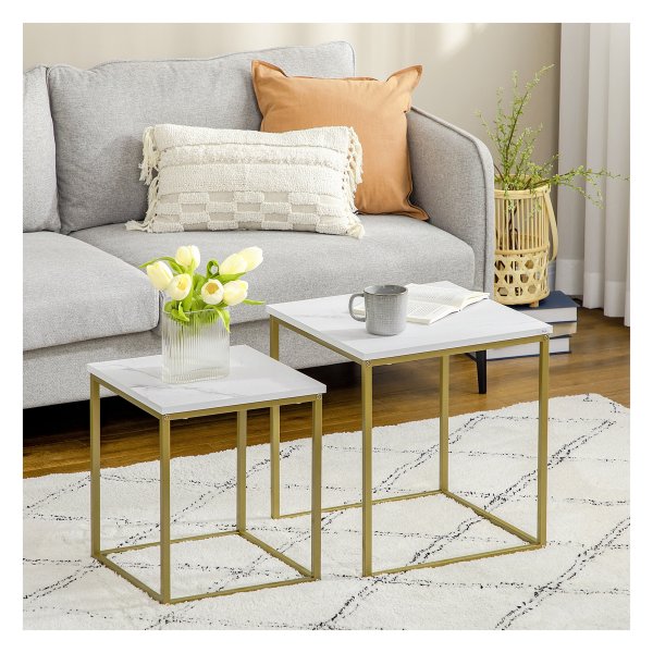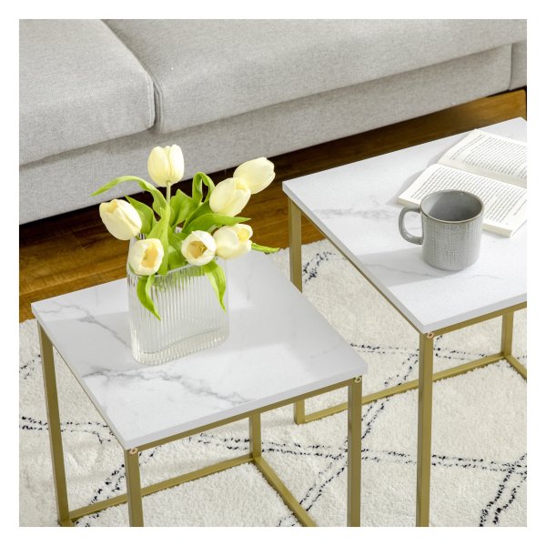 De verstelbare voetkussens zorgen voor stabiliteit en beschermen je vloer tegen krassen, terwijl de montage eenvoudig is dankzij de meegeleverde handleiding. De bijzettafel set wordt geleverd met zowel de grote als de kleine tafel, zodat je meteen aan de slag kunt met het stylen van je ruimte.