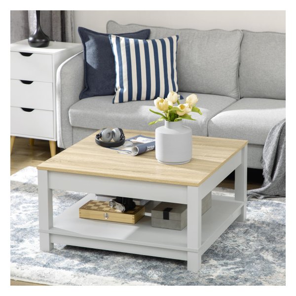 Met deze prachtige salontafel voegt u niet alleen stijl toe aan uw interieur, maar ook functionaliteit. Geniet van een kopje koffie of thee aan deze tafel en creëer zo een warme en luxueuze sfeer in uw woonkamer. Investeer in kwaliteit en verrijk uw interieur met deze Salontafel – Natural Living – Plank – Vierkant – Lichtgrijs van Zaza Home.