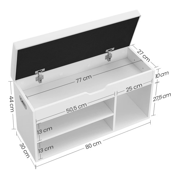 Met afmetingen van 30 x 80 x 44 cm (D x B x H) biedt deze halbank voldoende ruimte om tot 8 paar schoenen op te bergen in de onderste vakken. Onder de zitting bevindt zich een verborgen opbergvak van 7 cm hoog, perfect voor accessoires zoals handschoenen, boeken of schoenpoets.