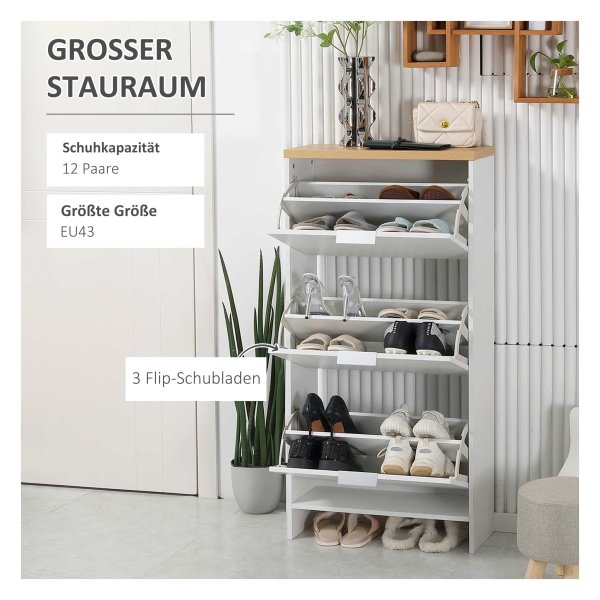 Met deze schoenenlade kunt u tot wel 12 paar schoenen opbergen in drie aparte compartimenten. Door de verstelbare binnenvloeren kunnen schoenen van verschillende hoogten moeiteloos worden opgeborgen, waardoor uw entree, gang of slaapkamer altijd netjes en georganiseerd blijft.