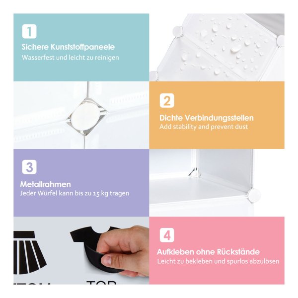 De kast is gemaakt van duurzaam materiaal, waaronder stevig PP-materiaal en metaal, wat zorgt voor een solide en stabiele constructie. De flexibele plastic leden van de kast combineren veiligheid en stevigheid, zodat u zonder zorgen uw spullen kunt opbergen. De kast wordt geleverd met duidelijke instructies voor eenvoudige montage, zodat u snel kunt genieten van de extra opbergruimte die het biedt.