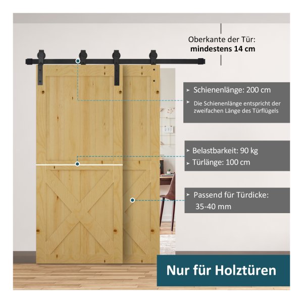 Het schuifdeursysteem is geschikt voor deuren met een dikte van 35-40 mm en kan eenvoudig gemonteerd worden op zowel cement- als houten wanden. Let op: het wordt niet aanbevolen om het systeem te installeren op schuim- of holle bakstenen muren.