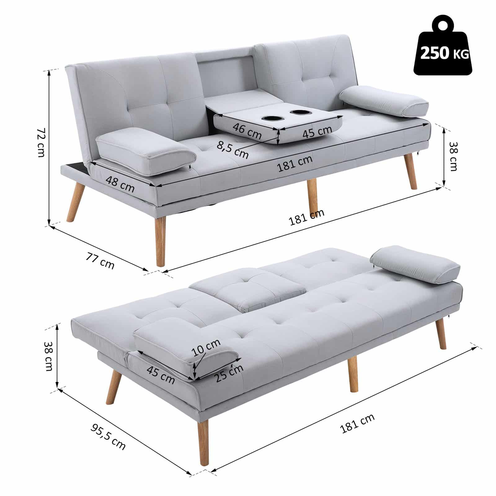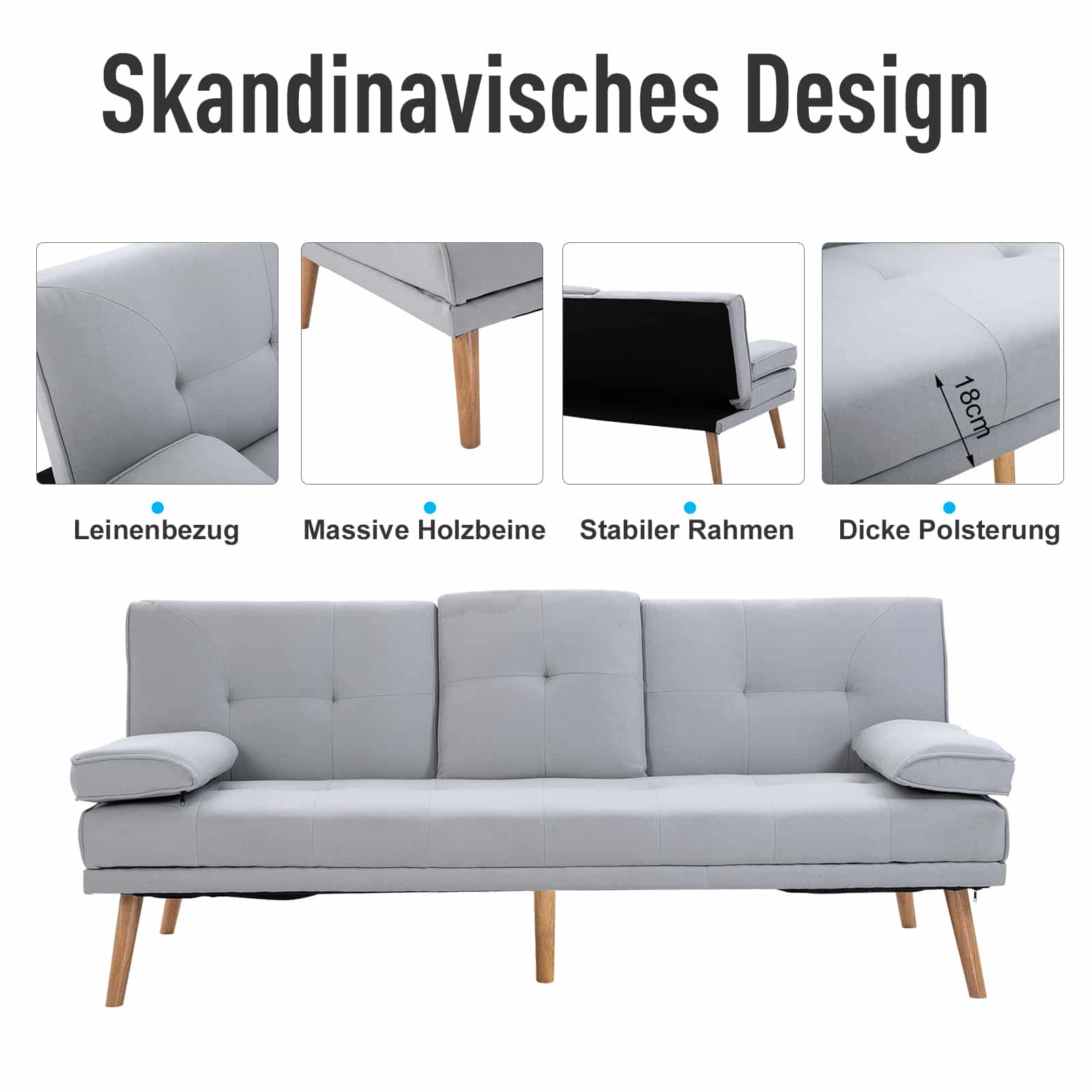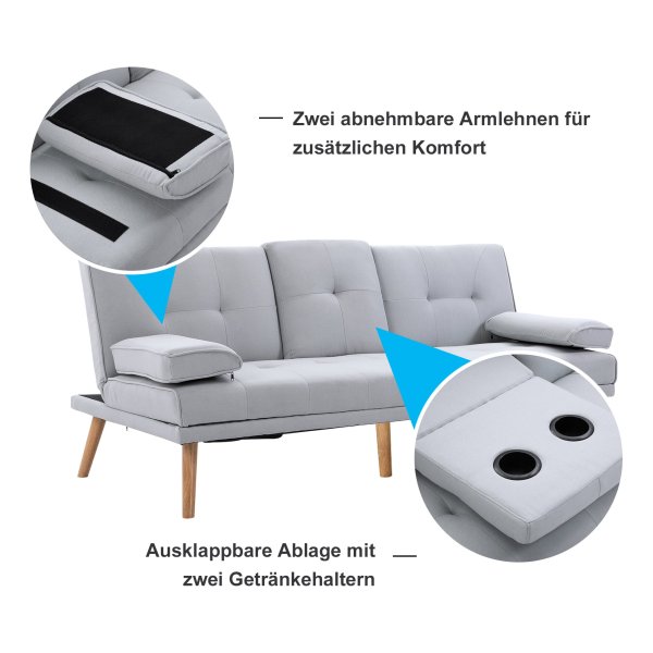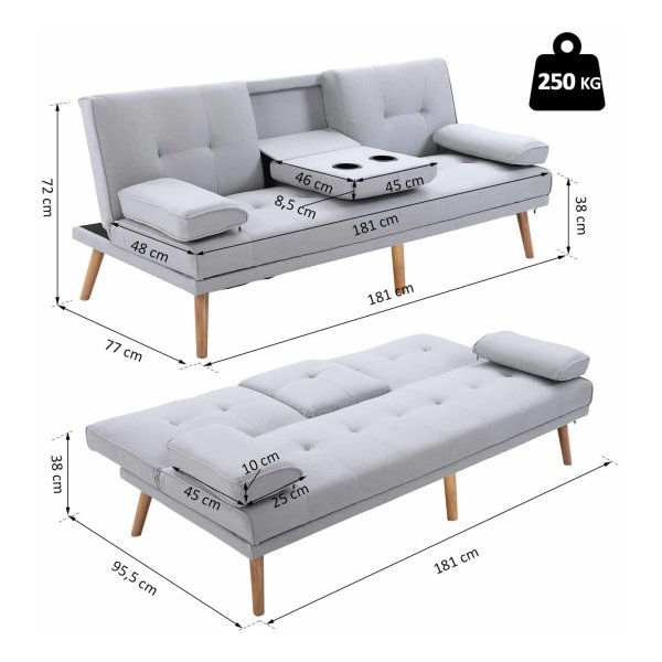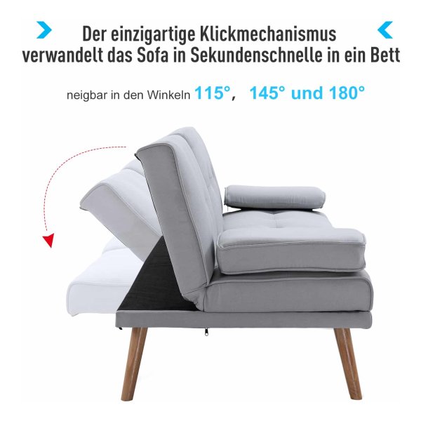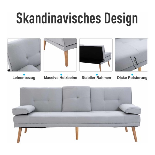 De bank is vervaardigd van hoogwaardige materialen zoals linnen en schuim, waardoor duurzaamheid en comfort worden gecombineerd. De afmetingen van de 3-zitsbank zijn 181 x 77 x 78 cm als zitbank en 181 x 95.5 x 42 cm als bed, waardoor deze perfect is voor verschillende situaties. De rugleuning kan worden versteld in drie posities (115 °, 145 °, 180 °), zodat je altijd de ideale zithouding kunt vinden.