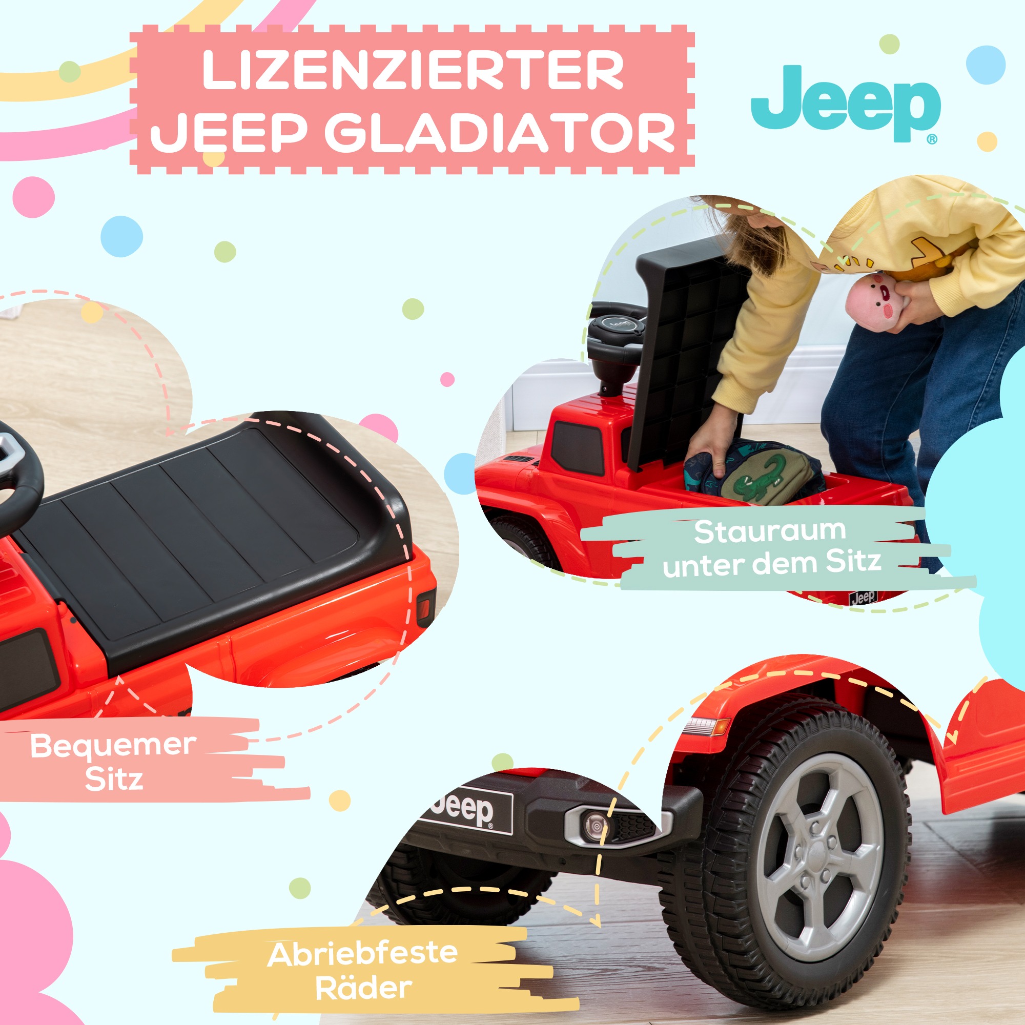 - Uitgerust met een hoorn, een stuurwiel en een opslagruimte voor maximaal plezier, zodat kinderen zich echt een echte chauffeur voelen.