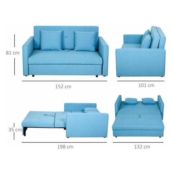 Met afmetingen van 152B x 101D x 81H cm in de bankpositie en een bed van 132B x 198D x 35H cm, biedt dit meubelstuk voldoende slaapruimte voor twee personen. Het maximale gewicht dat het bed kan dragen is 200 kg, terwijl de stoel een gewicht tot 100 kg kan ondersteunen. De opbergruimte heeft een maximale belasting van 20 kg, ideaal voor het opbergen van extra kussens of dekens.