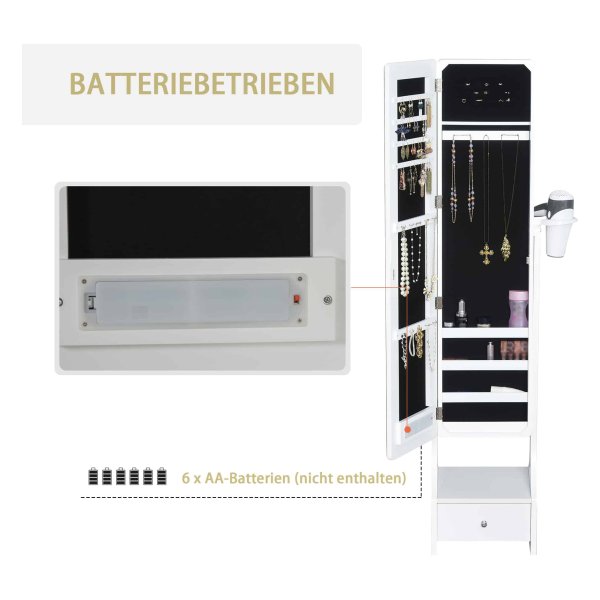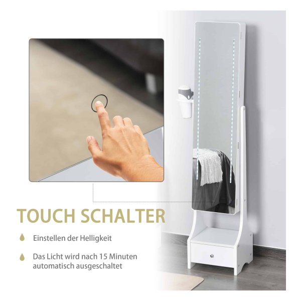 Deze sieradenkast is gemaakt van robuust en duurzaam MDF-materiaal en is voorzien van LEDlampen die een fel licht geven tijdens het aankleden. Met de handige aanraakschakelaar onderaan de kast kunt u de helderheid van het licht naar wens aanpassen. Bovendien schakelt het licht automatisch uit na 15 minuten gebruik, waardoor u energie bespaart.
