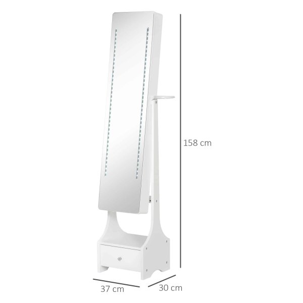 Met een totale afmeting van 37 cm breed, 30 cm diep en 158 cm hoog, past deze sieradenkast perfect in elke ruimte. De spiegel heeft een afmeting van 120 cm lang en 30 cm breed, waardoor u een volledig zicht heeft tijdens het aankleden. De kast zelf is 30 cm breed, 10 cm diep en 120 cm hoog, met een handige lade van 22,5 cm breed en 27,5 cm hoog.