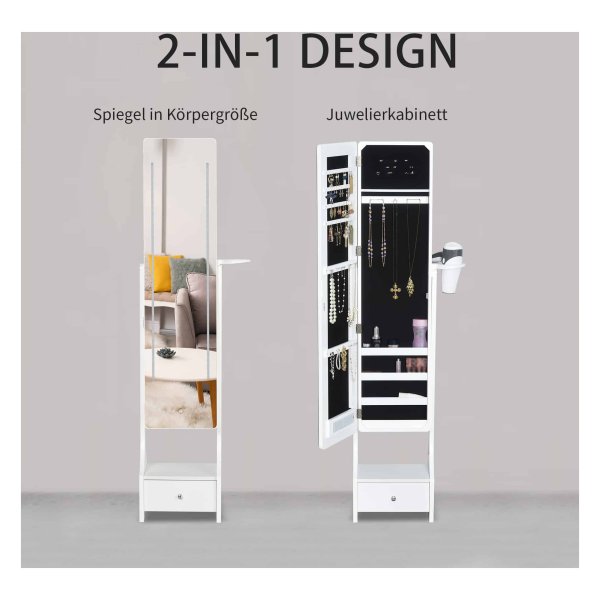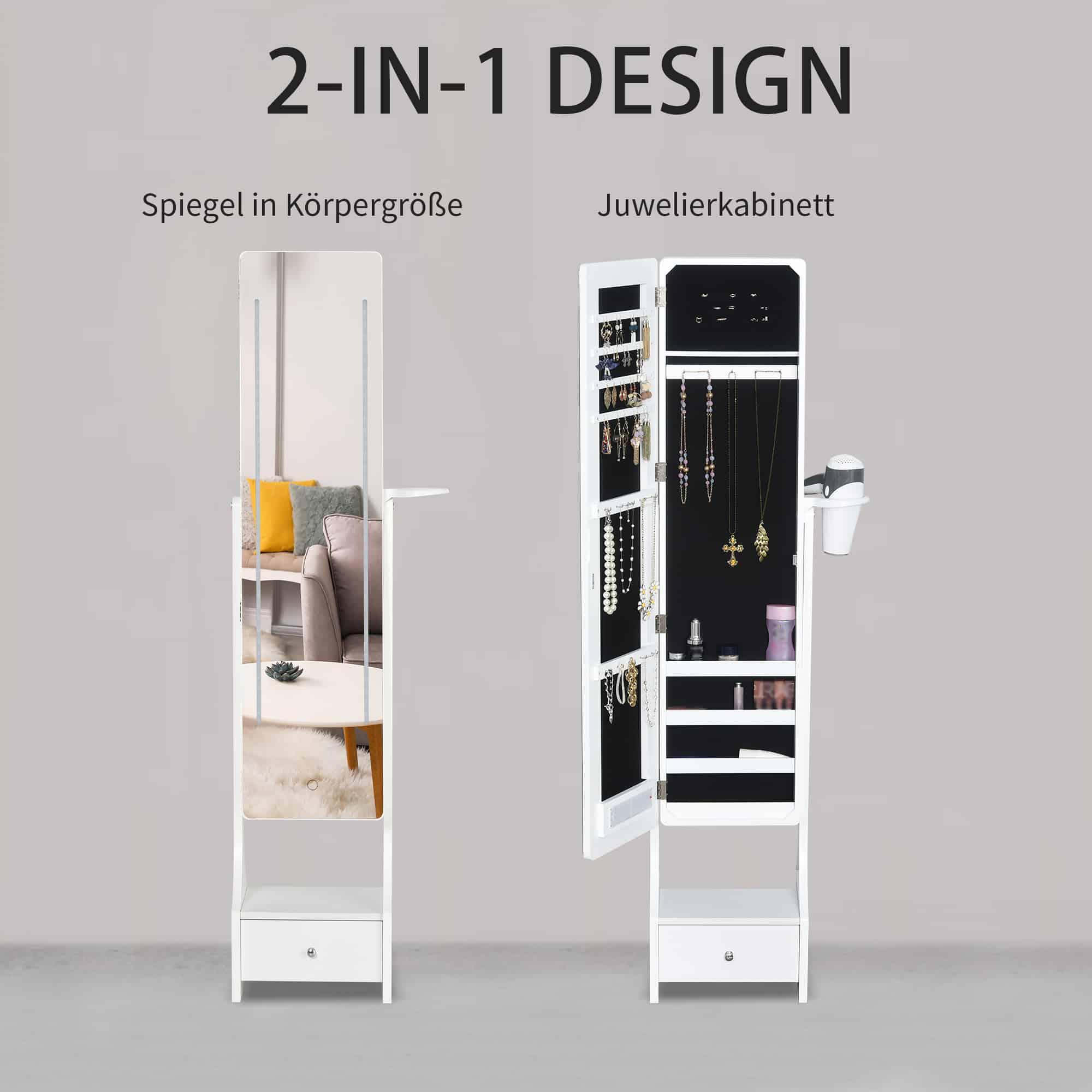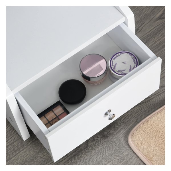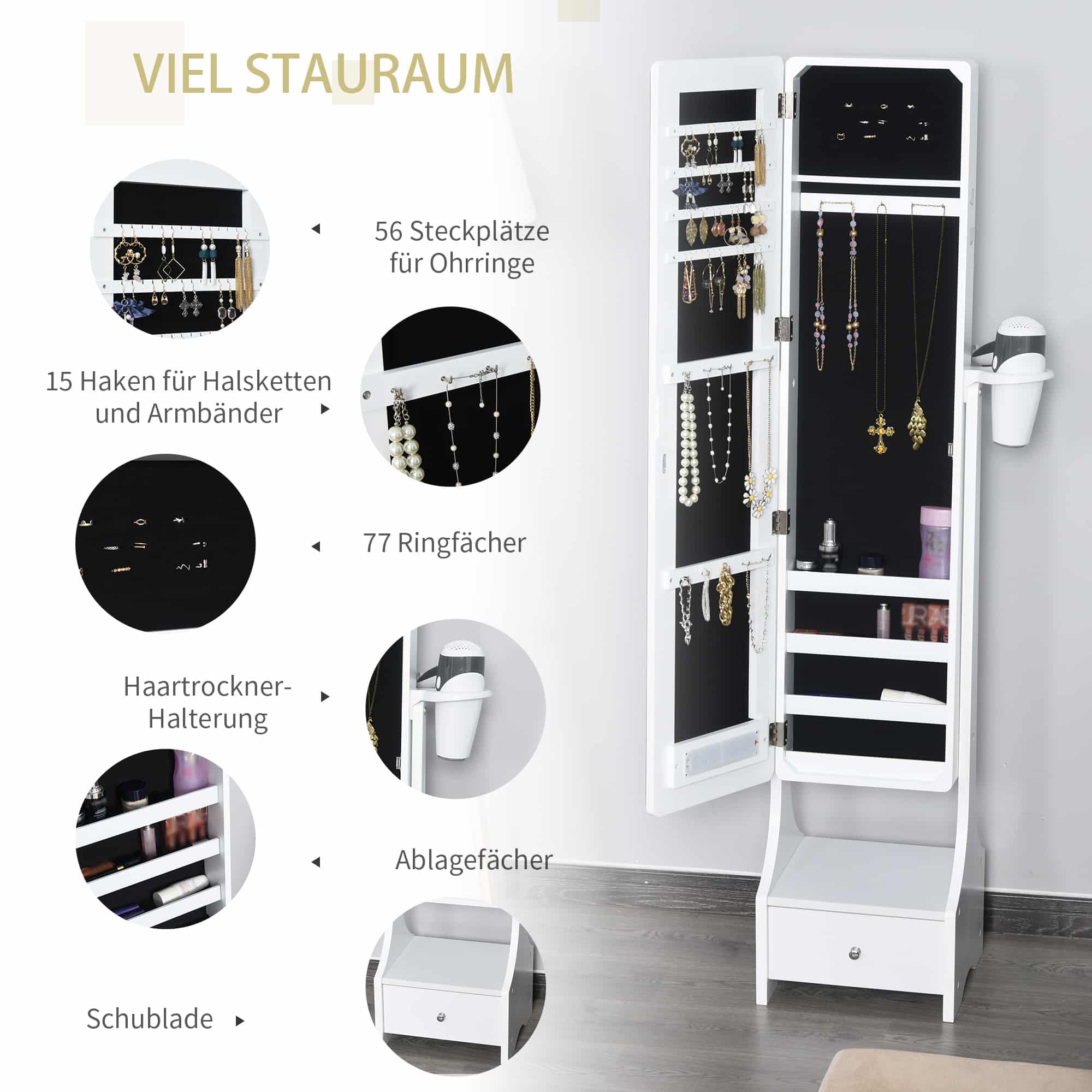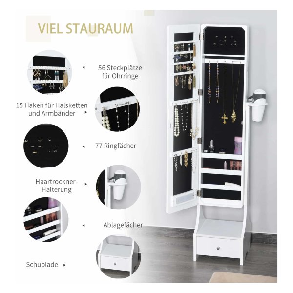 De kast biedt veel opslagruimte met speciale vakken voor oorbellen, kettingen, armbanden, ringen en andere accessoires. Daarnaast is er een handige lade voor het opbergen van kleine items. De zijhaardrogerhouder zorgt ervoor dat u uw haar gemakkelijk en comfortabel kunt fƶhnen terwijl u zich klaarmaakt.