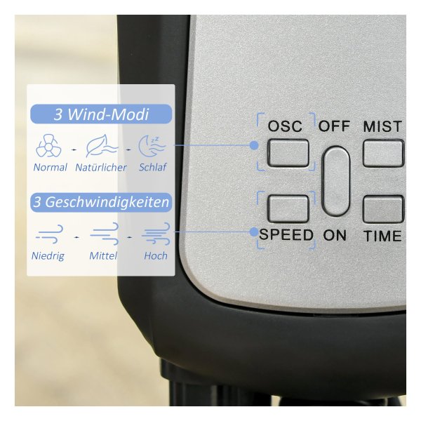 Met de timerfunctie kan je de ventilator tot 7,5 uur later automatisch uitschakelen, voor extra gemak en energiebesparing. Daarnaast kan zowel de ventilator als de mistfunctie apart of samen gebruikt worden.