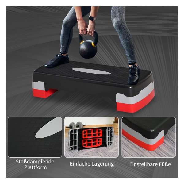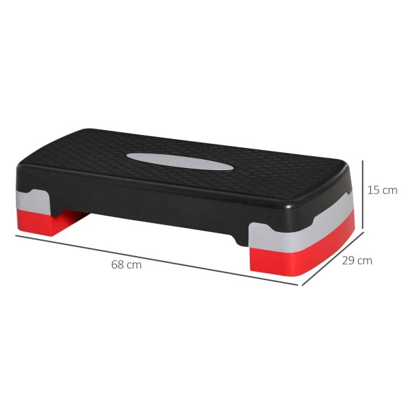De stepper is vervaardigd uit hoogwaardig plastic in een elegante zwarte kleur, gecombineerd met grijze en rode accenten. Met afmetingen van 68L x 29B x 15H cm en een maximale belasting van 150 kg, is deze stepper geschikt voor intensief gebruik en sporters van verschillende groottes en gewichten.