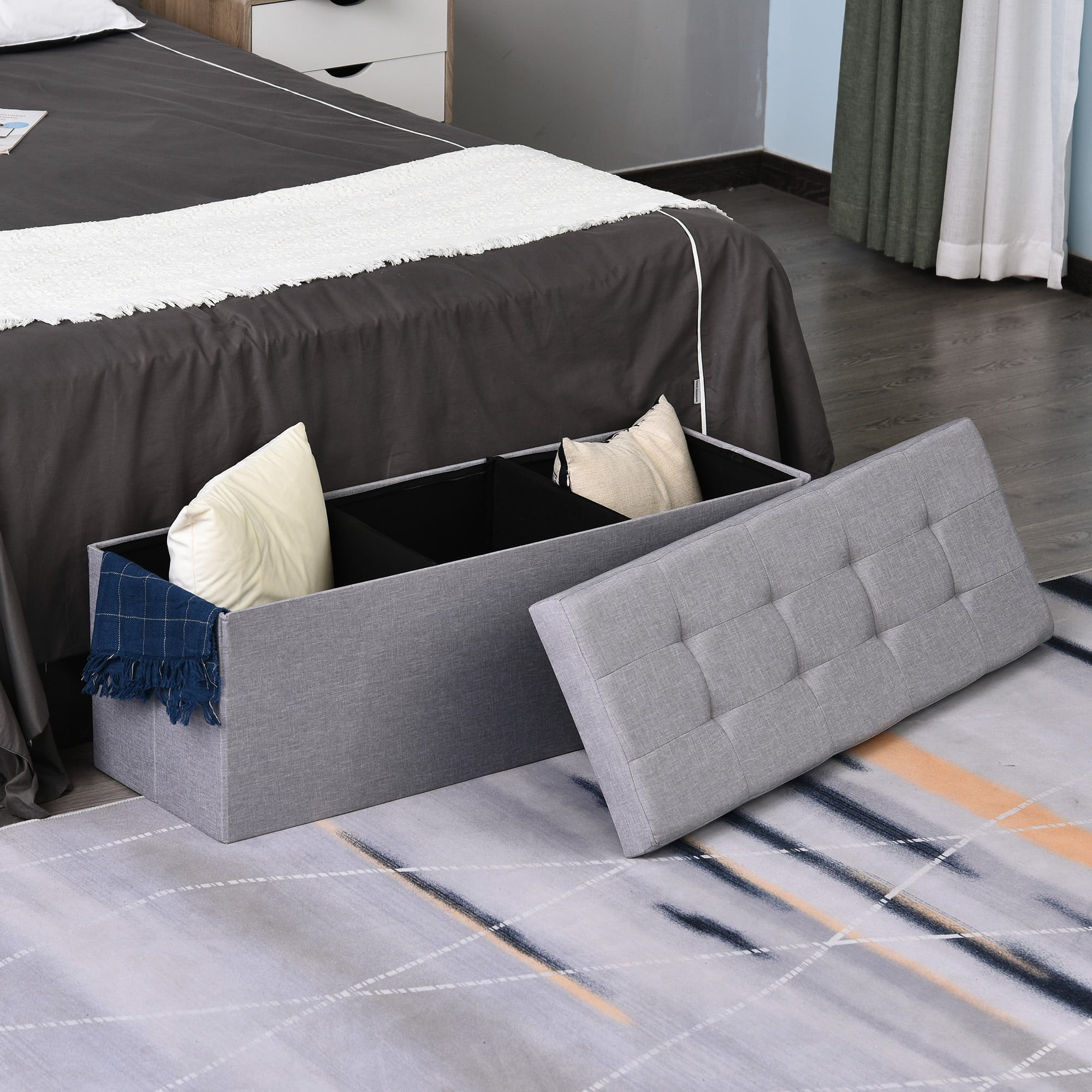 Ben je op zoek naar een multifunctioneel meubelstuk dat zorgt voor zitplaatsen en opbergruimte in één? De opbergbank van ComfortLiv is de perfecte oplossing voor jouw huis. Met een elegant ontwerp en een comfortabele zitting in een grijze stoffering, is deze opvouwbare bank een aanwinst voor elke ruimte.