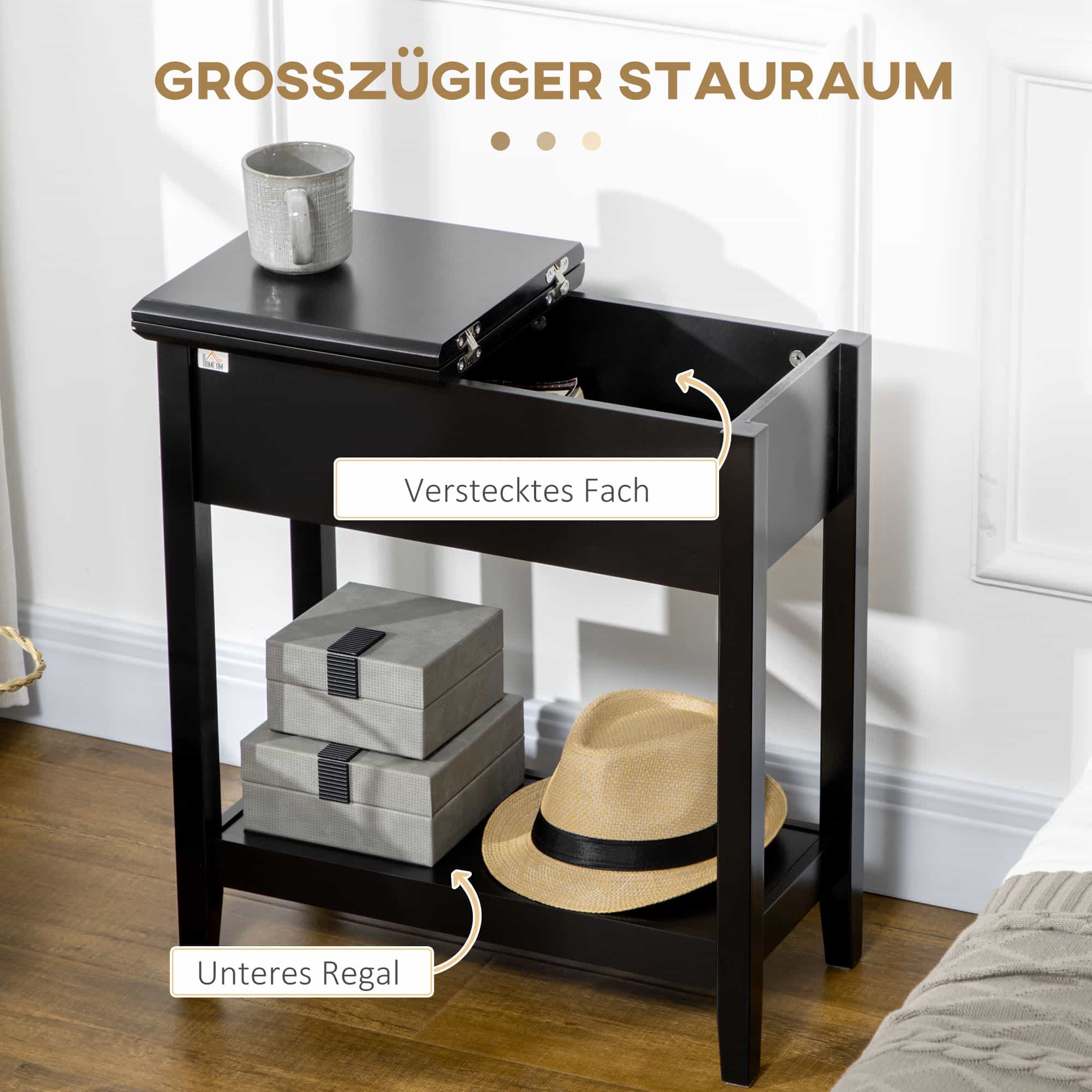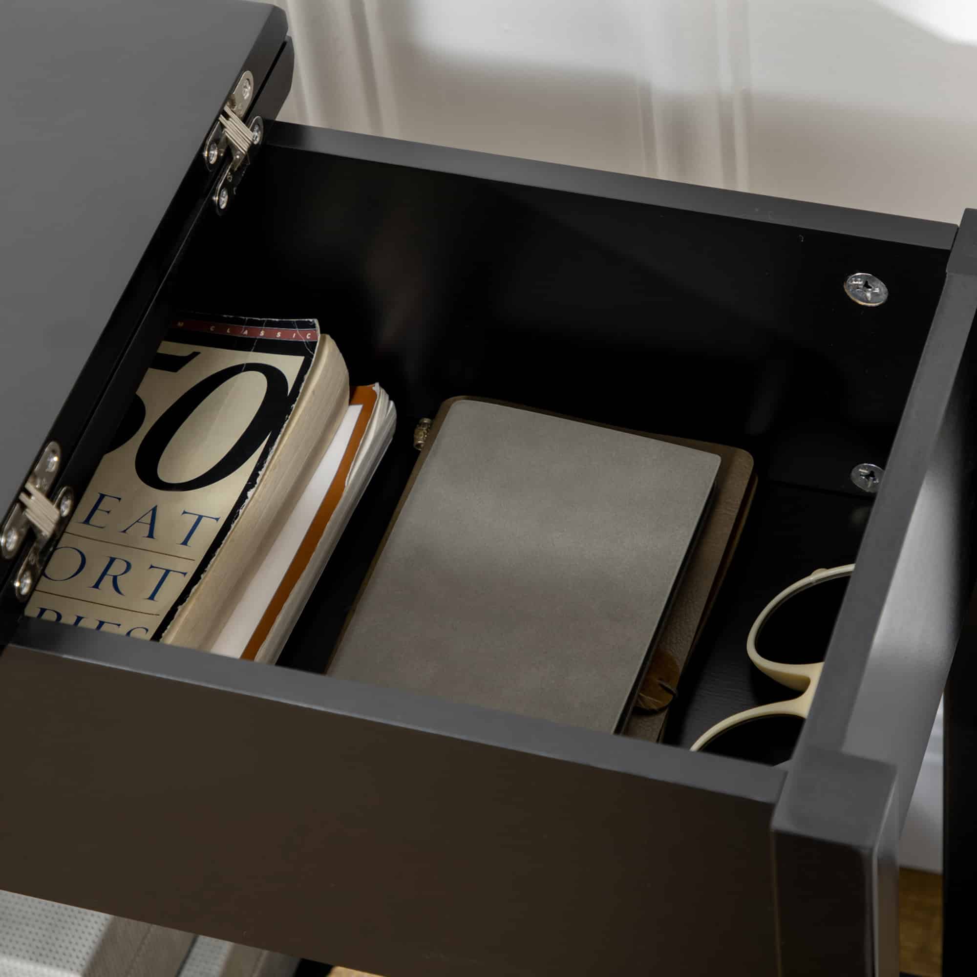 De Zaza Home supplemententafel is ook zeer praktisch in gebruik. Het scharnierende tafelblad onthult een handig compartiment waarin u uw accessoires discreet kunt opbergen. Daarnaast biedt een extra plank onderaan de tafel nog meer opslagruimte voor uw spullen.