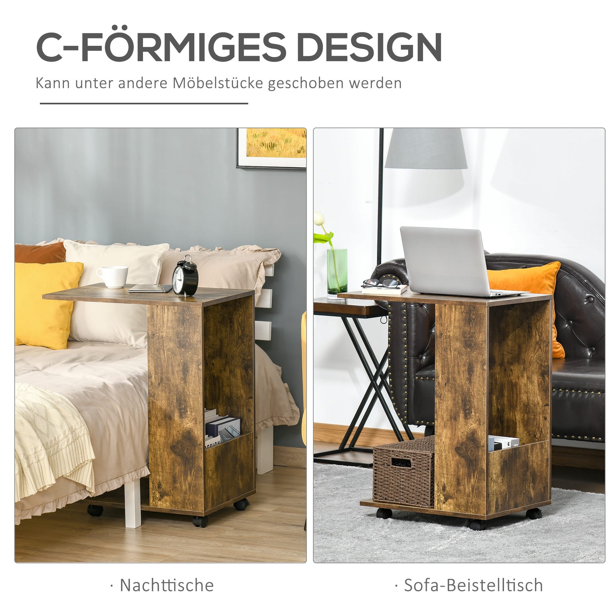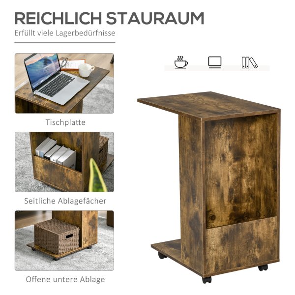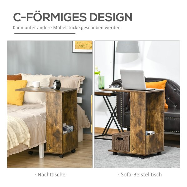 Deze tafel heeft een uniek C-vormig ontwerp, waardoor hij veelzijdig in gebruik is. Het tafelblad biedt voldoende ruimte voor decoratieve items, tijdschriften, boeken, een laptop en meer. Daarnaast beschikt deze bijzettafel over een handig zijcompartiment waar je extra spullen kunt opbergen.