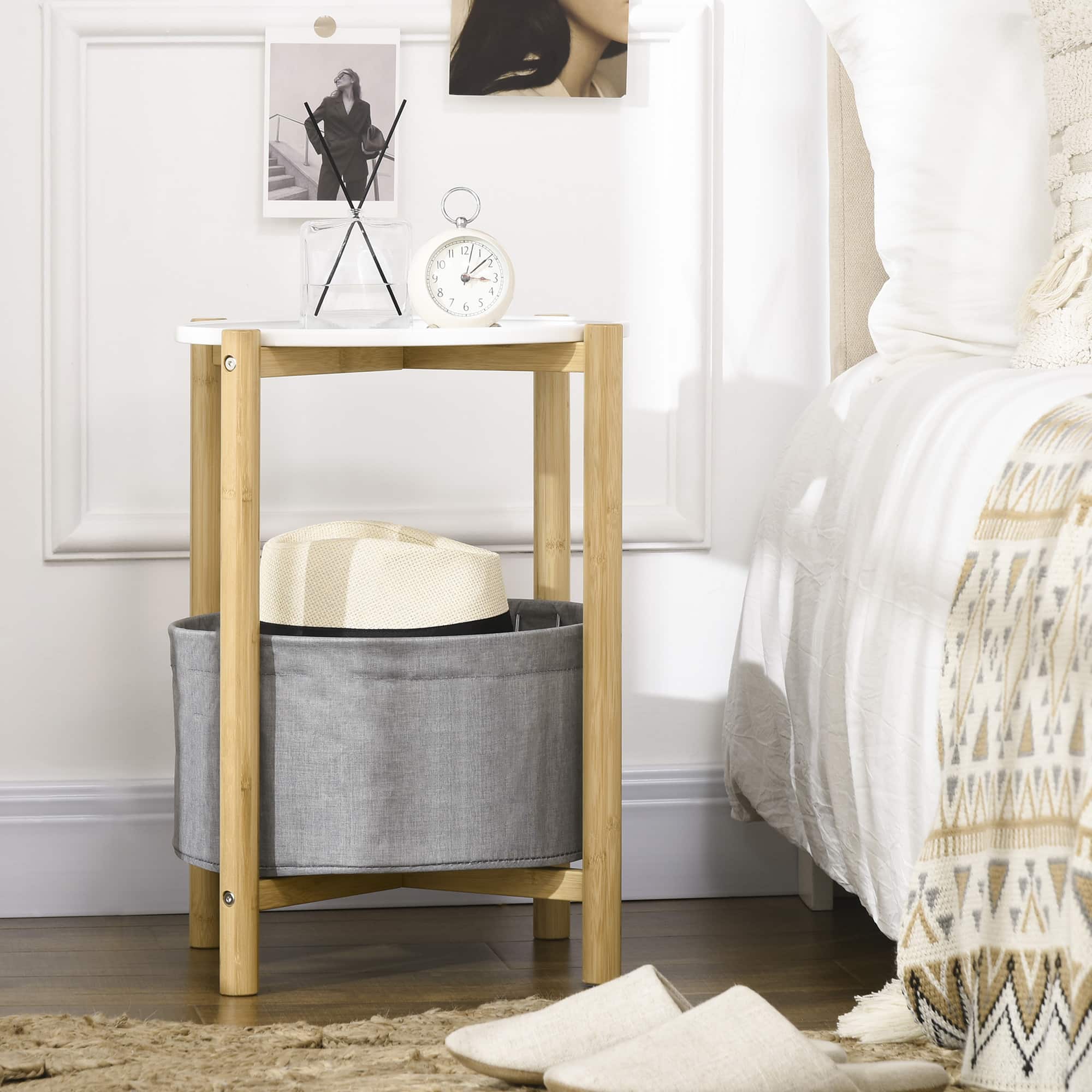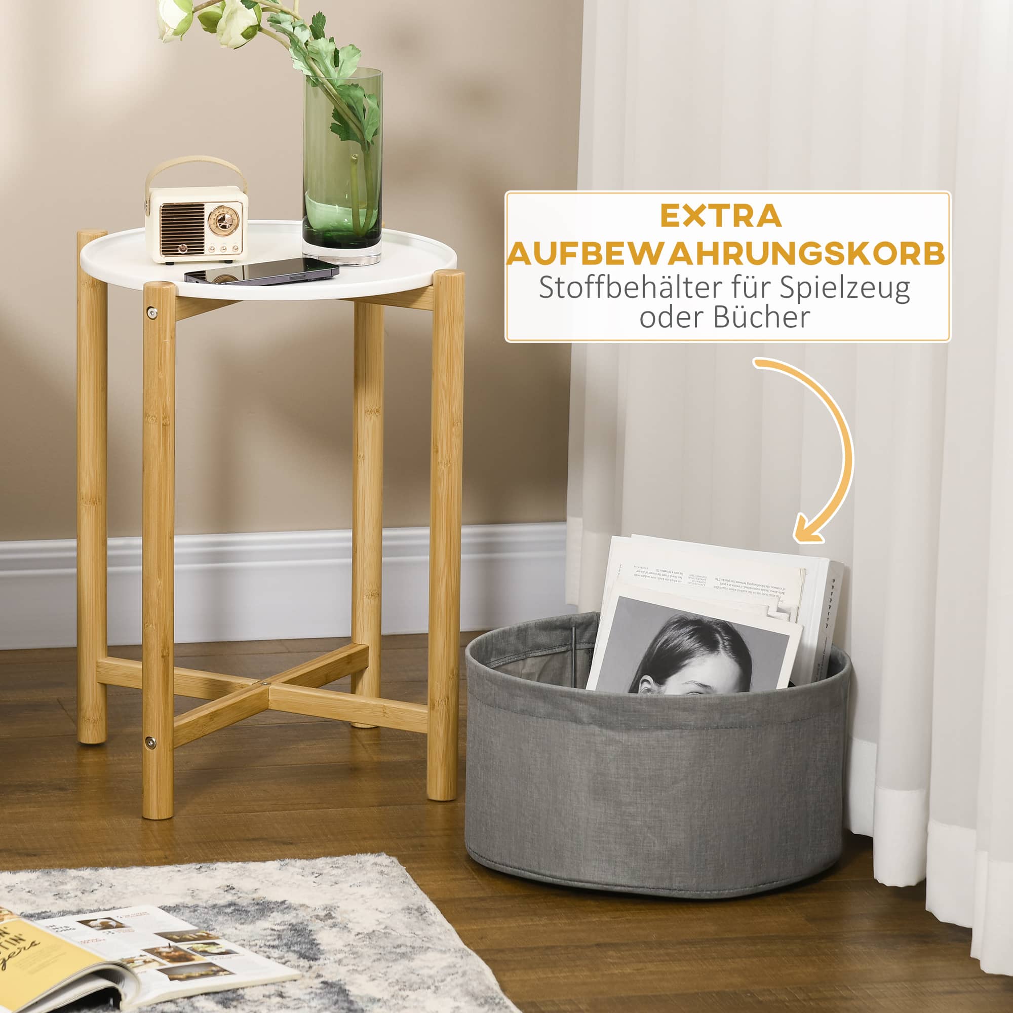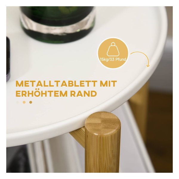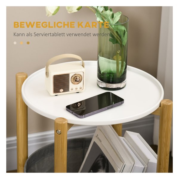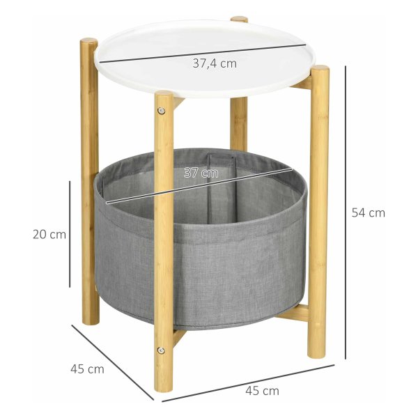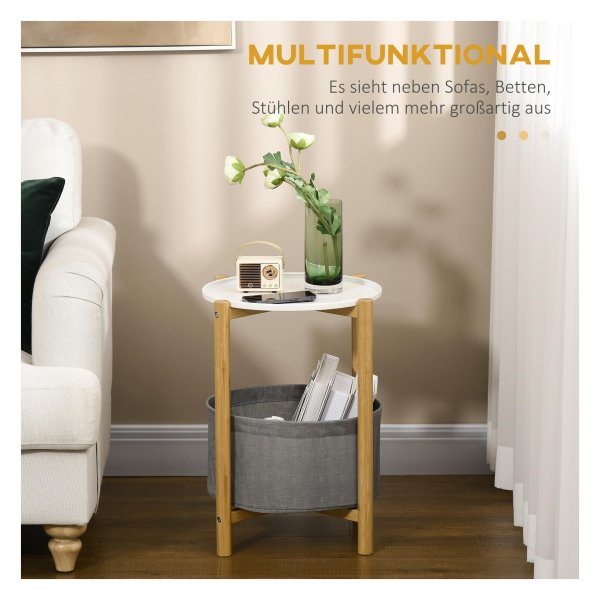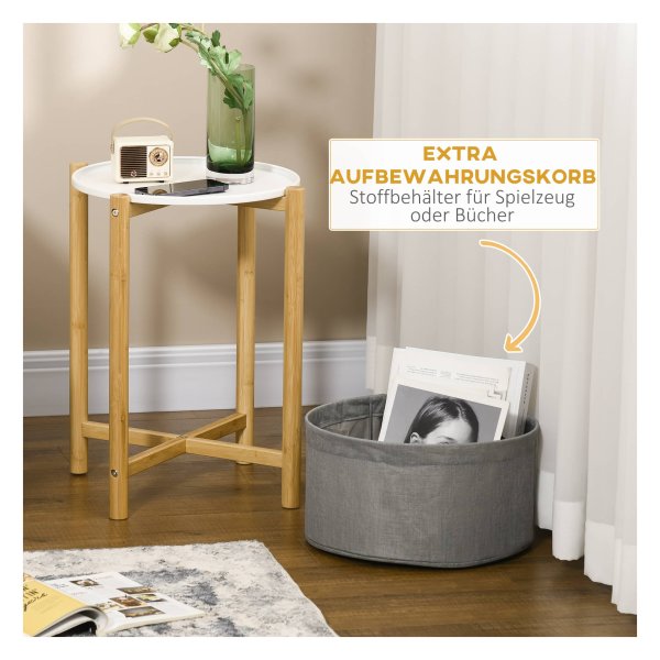 Deze bijzettafel is niet zomaar een standaard meubelstuk. Het beschikt over een handig verwijderbaar dienblad en een opbergmand, waardoor u extra ruimte creëert voor het opbergen van diverse items. Hierdoor blijft uw woonkamer opgeruimd en overzichtelijk. Daarnaast zorgt de verhoogde rand van het tafelblad ervoor dat uw spullen veilig op hun plek blijven liggen.
