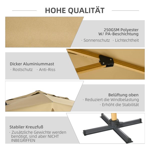 Let op: Voor optimale stabiliteit is het aanbevolen om gewichten voor de parapluvoet (100-110 kg) toe te voegen. Deze zijn niet inbegrepen, maar kunnen apart worden aangeschaft.