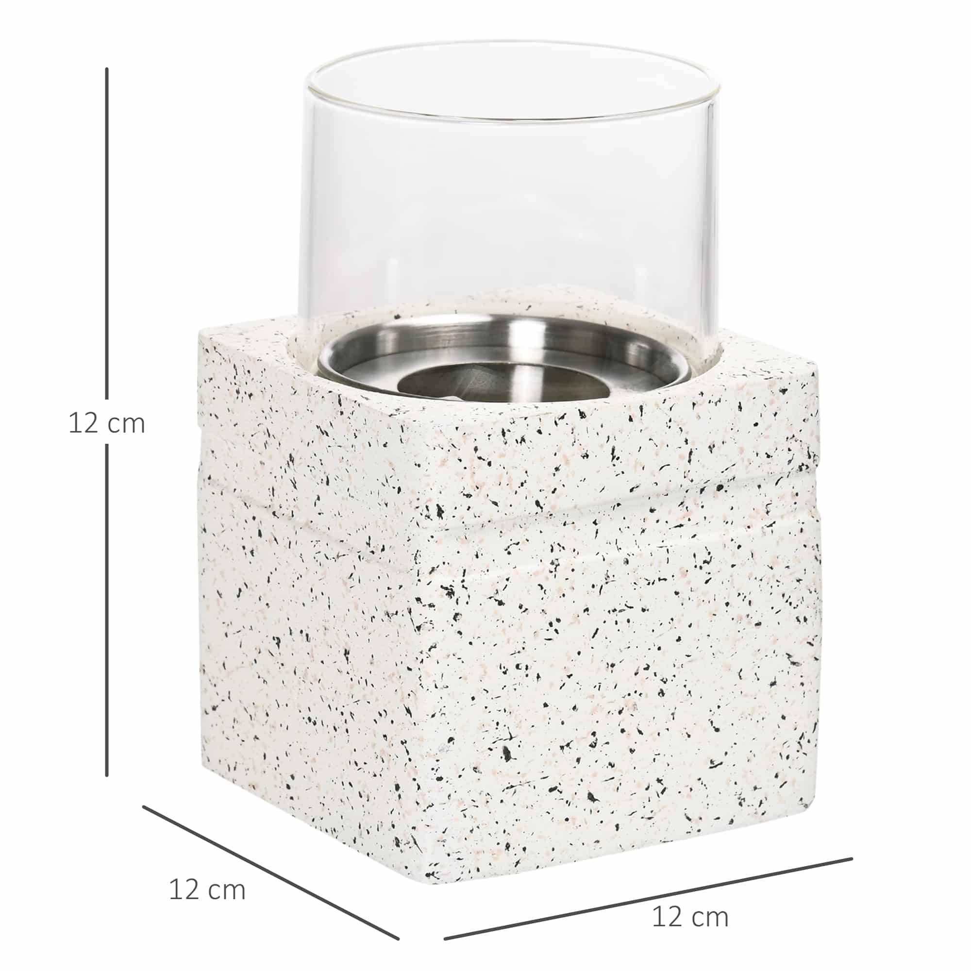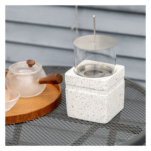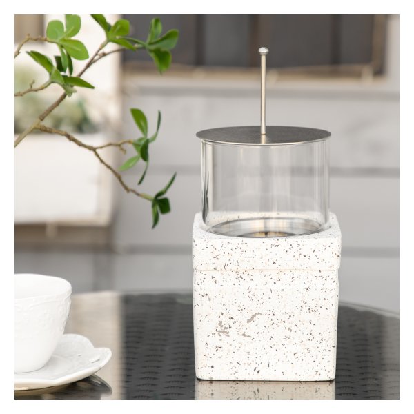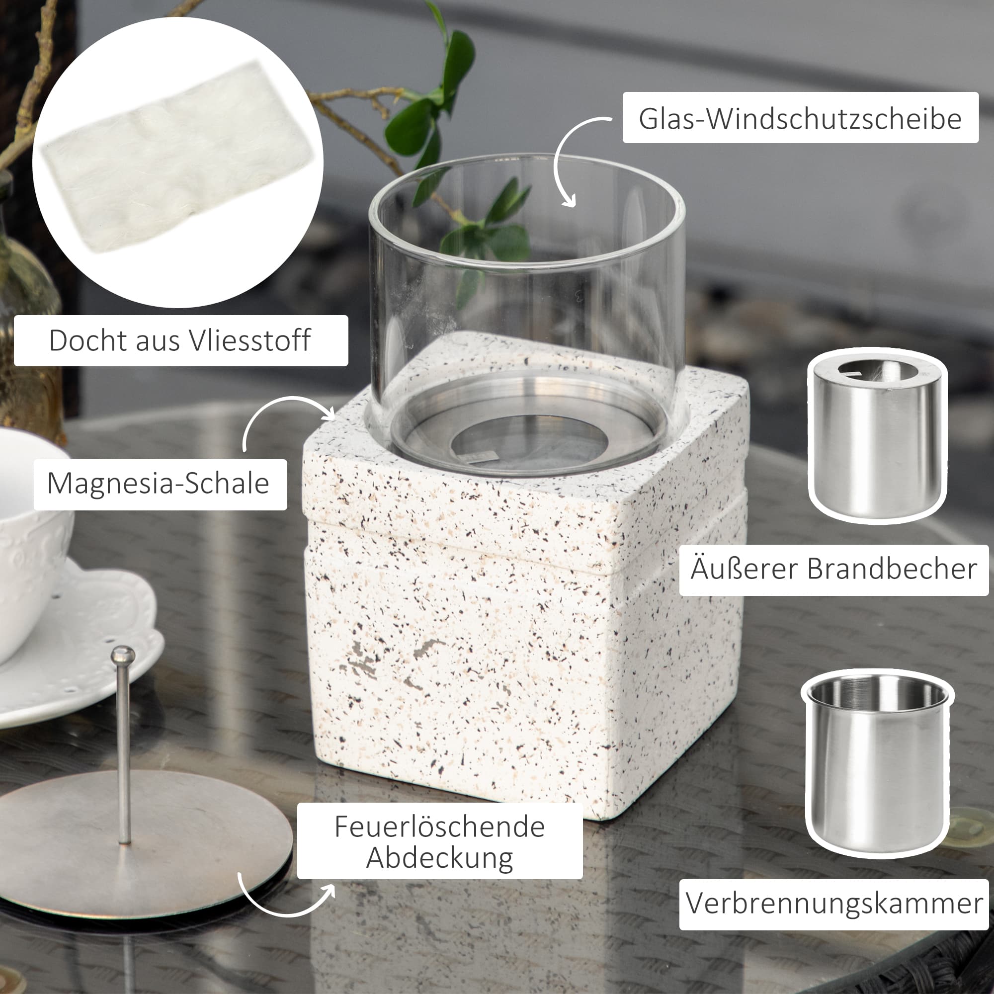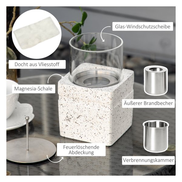 De tafelhaard is uitgevoerd in een elegante grijze kleur en gemaakt van hoogwaardige materialen zoals magnesia, roestvrij staal en glas. De afmetingen zijn 12l x 12b x 12h cm, met een branderkamer van 8,2 x 9,5 cm en een glasbescherming van Ø10 x 7,5H cm.