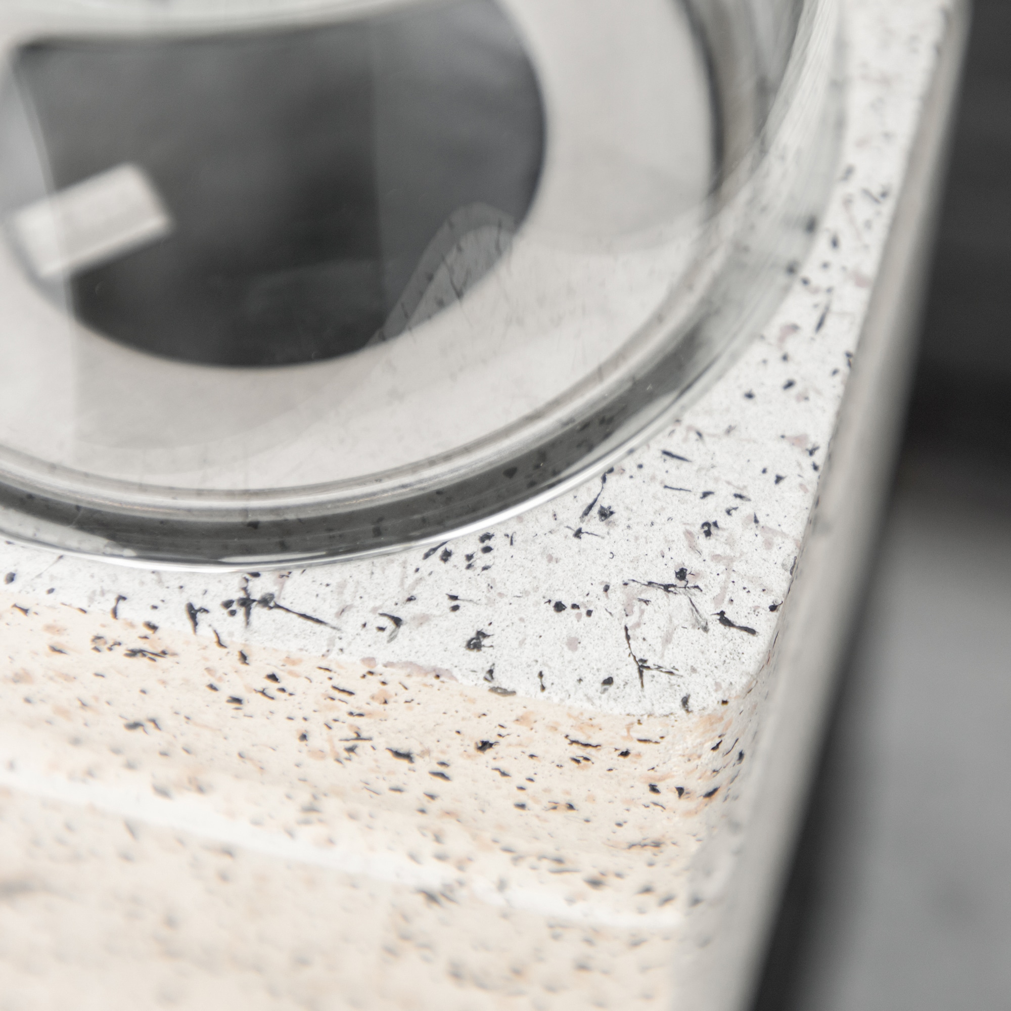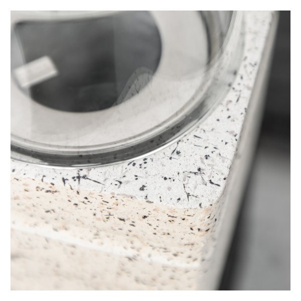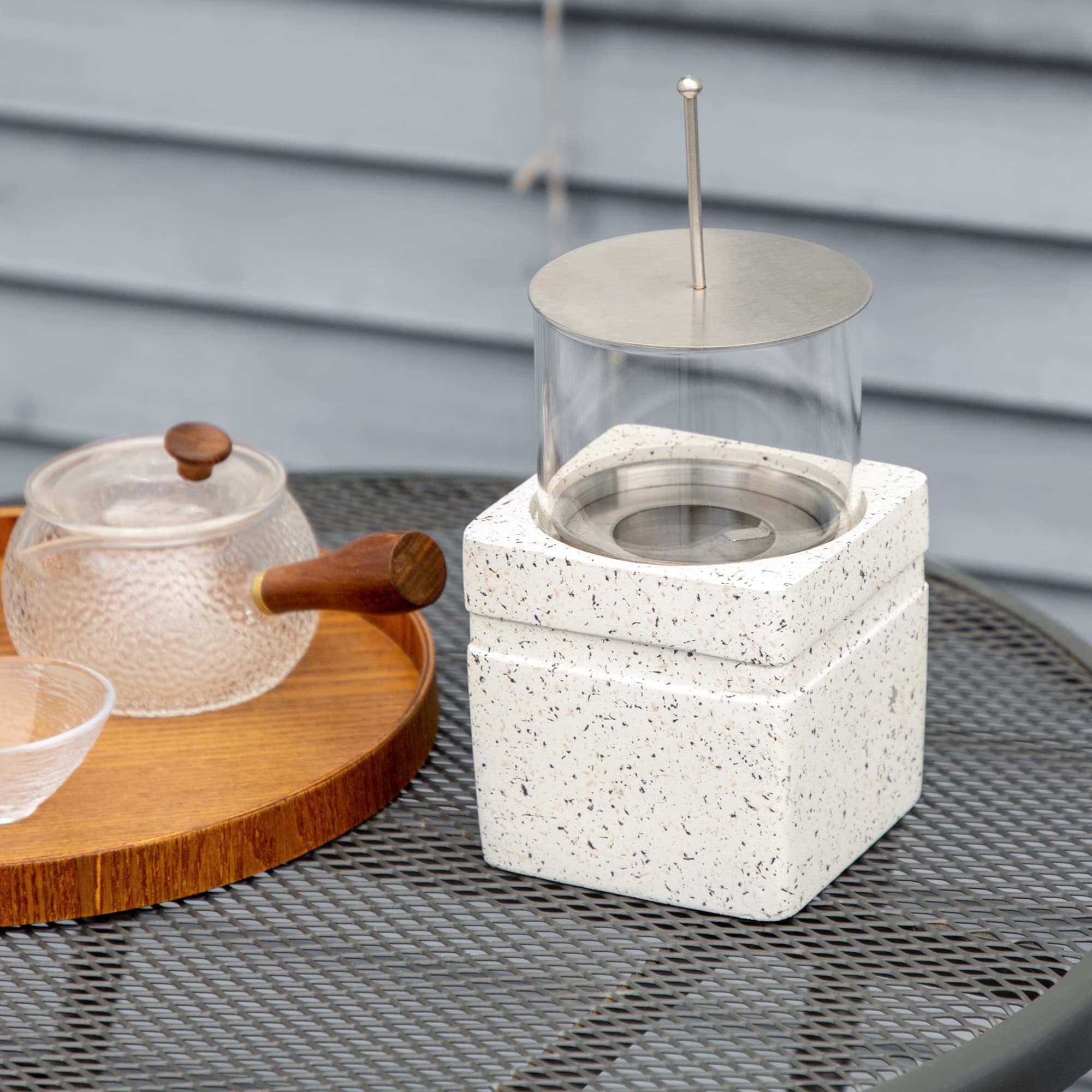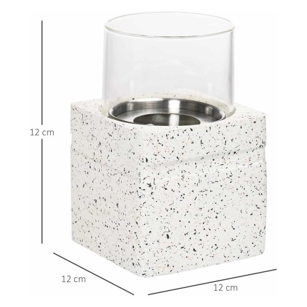 De tafelhaard is uitgevoerd in een elegante grijze kleur en gemaakt van hoogwaardige materialen zoals magnesia, roestvrij staal en glas. De afmetingen zijn 12l x 12b x 12h cm, met een branderkamer van 8,2 x 9,5 cm en een glasbescherming van Ø10 x 7,5H cm.