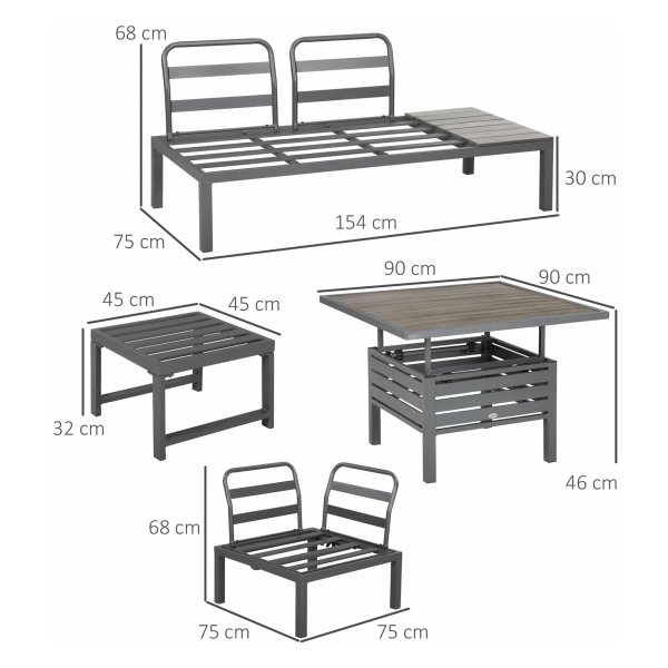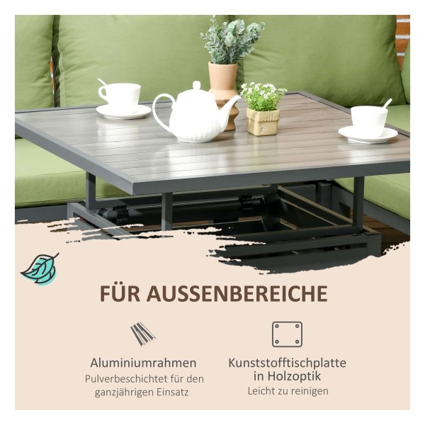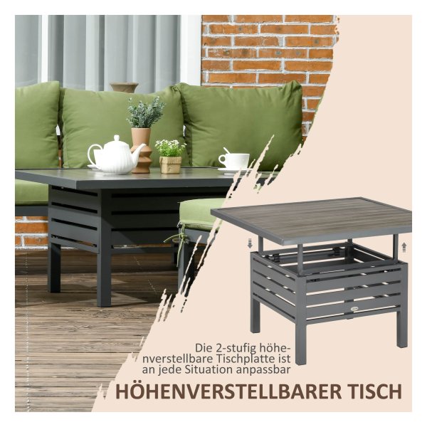 De set is uitgevoerd in een stijlvolle combinatie van groen en grijs, waardoor hij perfect past bij diverse tuinstijlen. De materialen aluminium, polyester, plastic en schuim zorgen voor duurzaamheid en comfort. De afmetingen van de afzonderlijke onderdelen zijn als volgt: