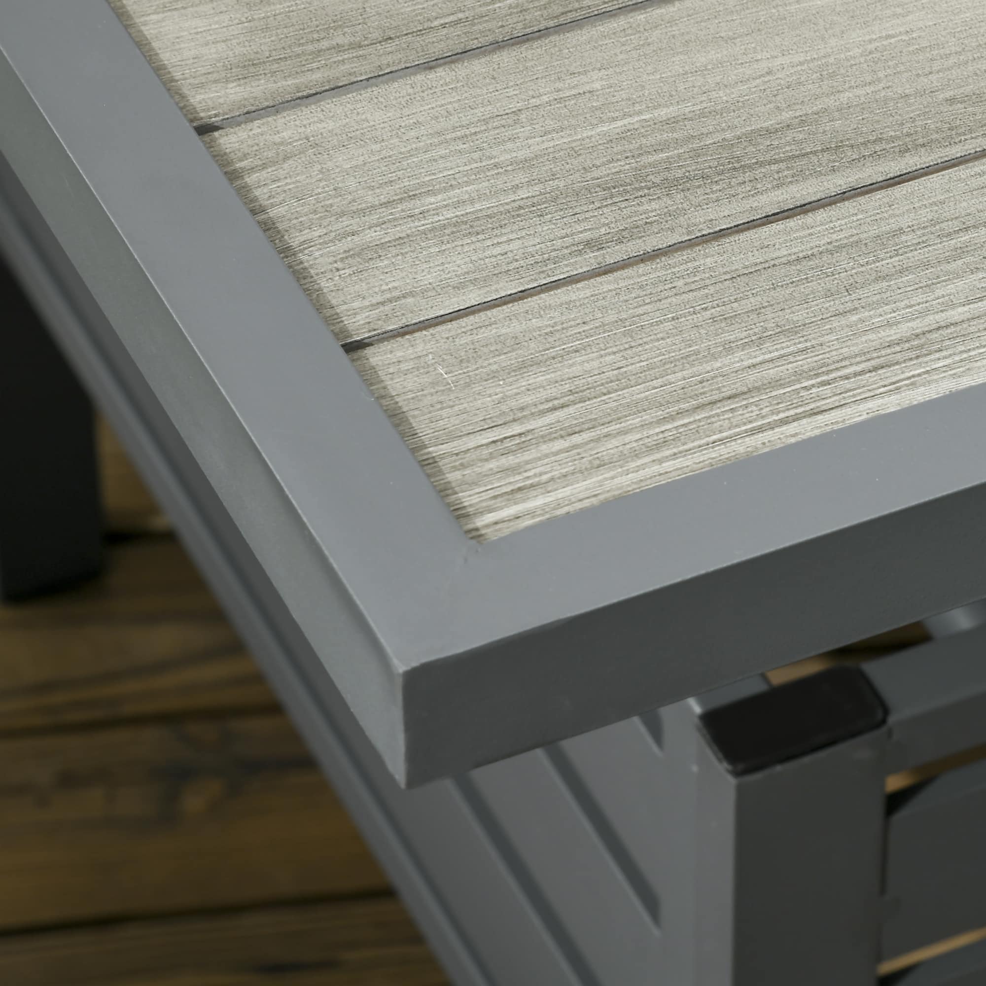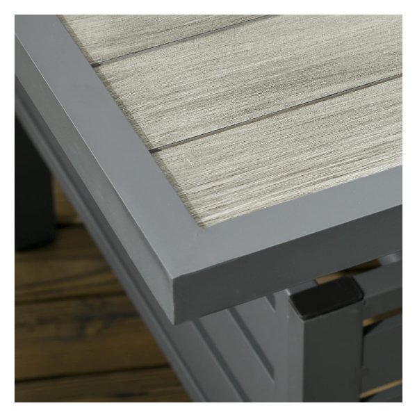 - De tafelbladen zijn gemaakt van weerbestendig plastic met een houten uitstraling, waardoor ze eenvoudig te reinigen zijn en bestand zijn tegen verschillende weersomstandigheden.