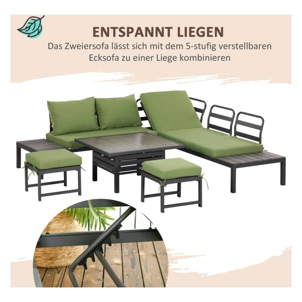 Met deze set kunt u zich aanpassen aan elke situatie en ruimte. De stevige aluminium frames van de afzonderlijke onderdelen garanderen duurzaamheid en langdurig gebruik, terwijl de dikke kussens zorgen voor een comfortabele zitervaring voor u en uw gasten.