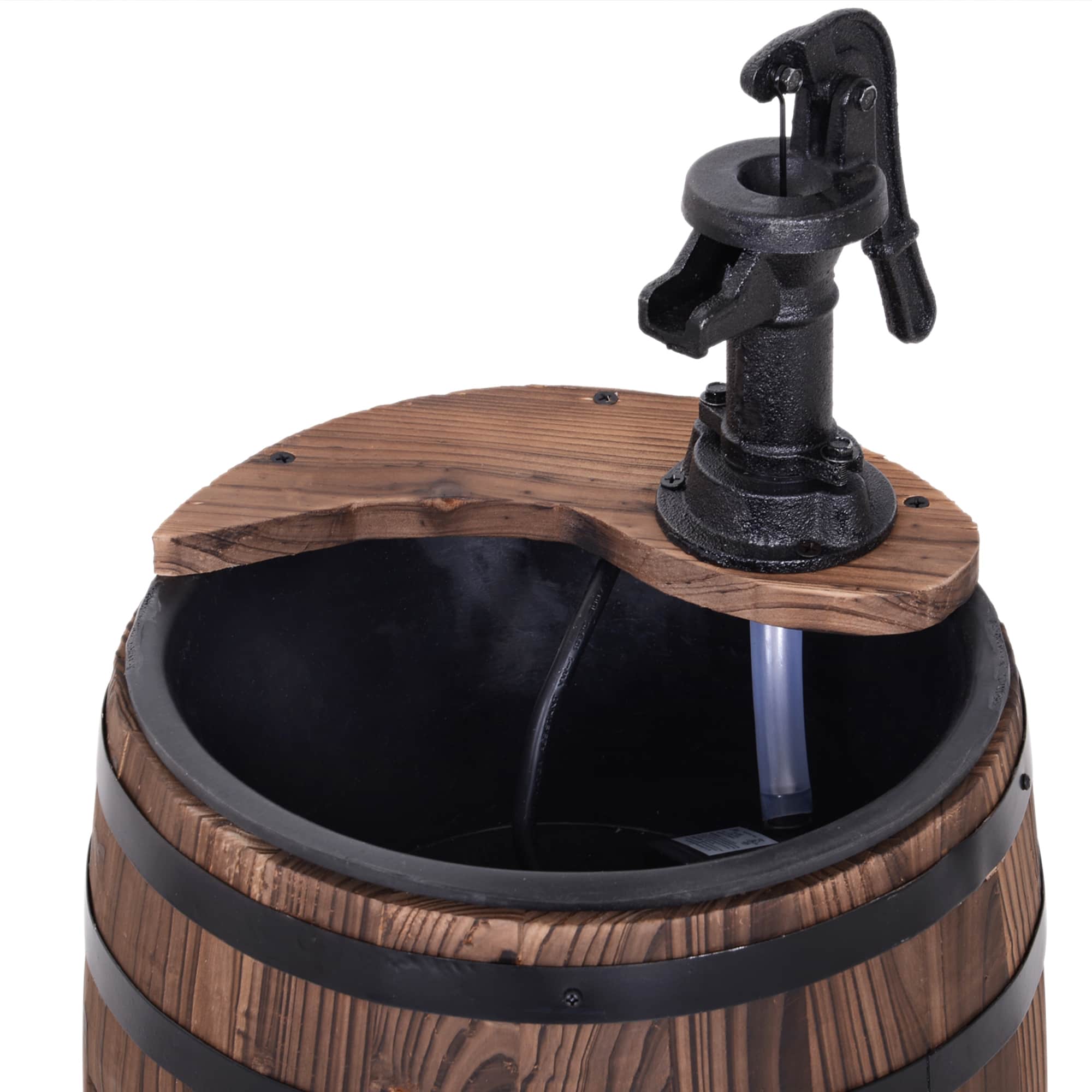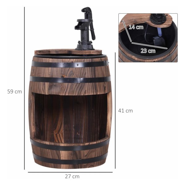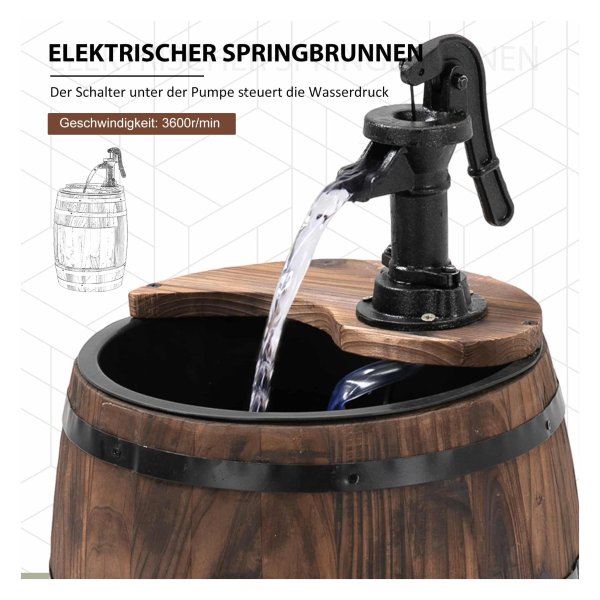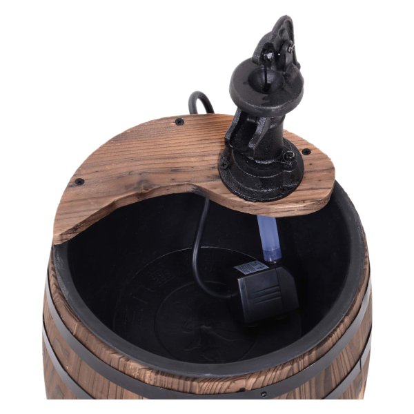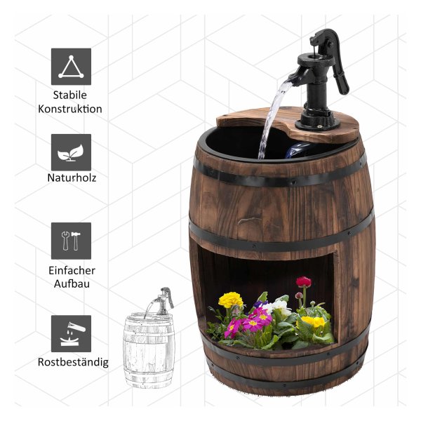 De houten regenton met plantenbak en tuinfontein in donkerbruin wordt geleverd inclusief een elektropomp en stekker voor eenvoudige installatie. De montage-instructies zorgen ervoor dat u de fontein snel en gemakkelijk in uw tuin kunt plaatsen.