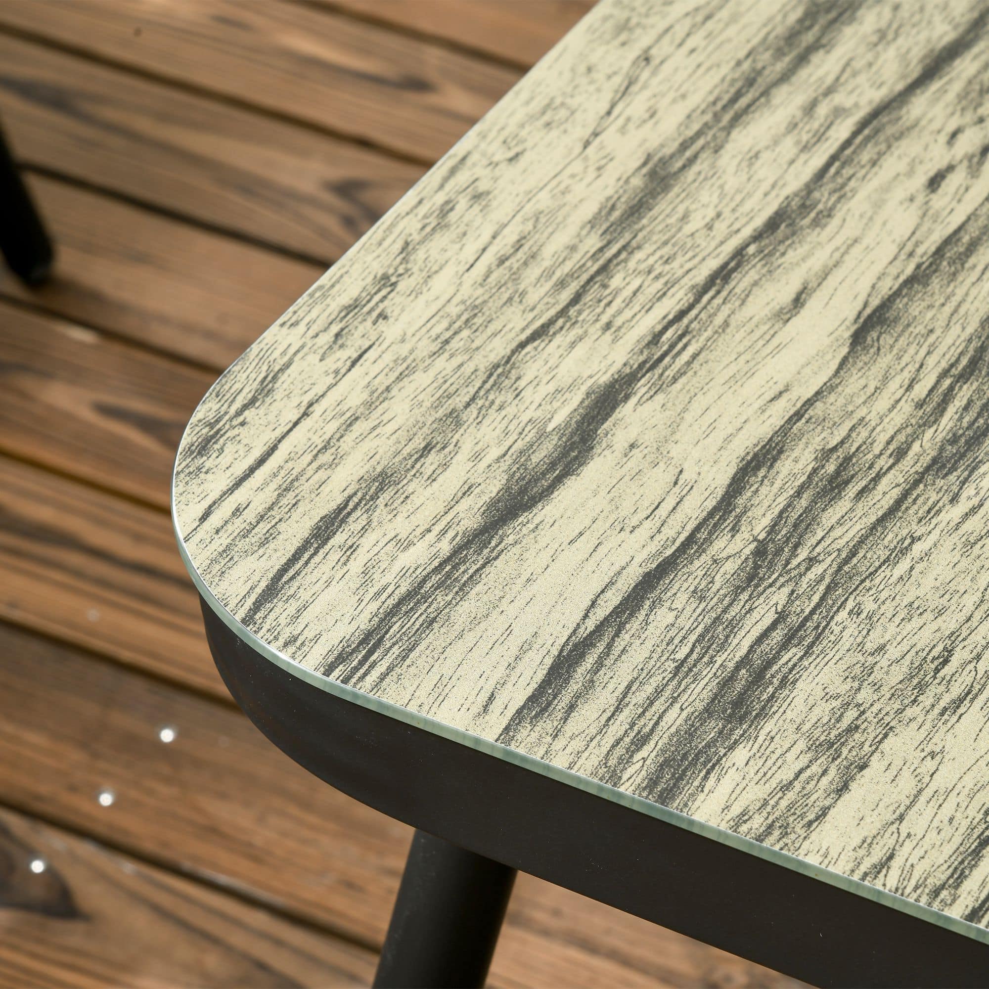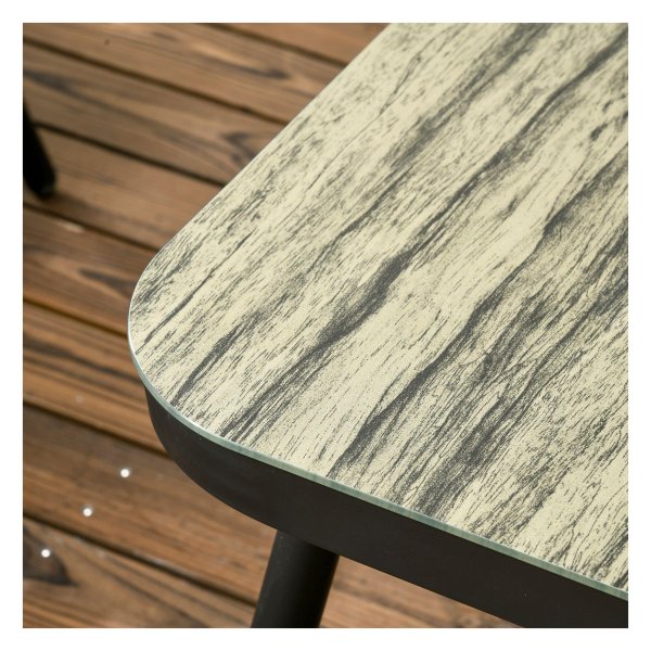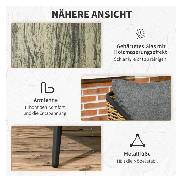 Gemaakt van een licht aluminium frame en handgeweven rattan zittingen in een trendy grijze kleur, zorgt de set voor een moderne uitstraling, duurzaamheid en stabiliteit. Het tafelblad is voorzien van hard glas voor eenvoudig onderhoud en een decoratieve look.