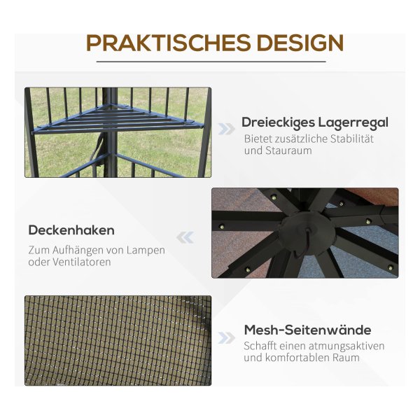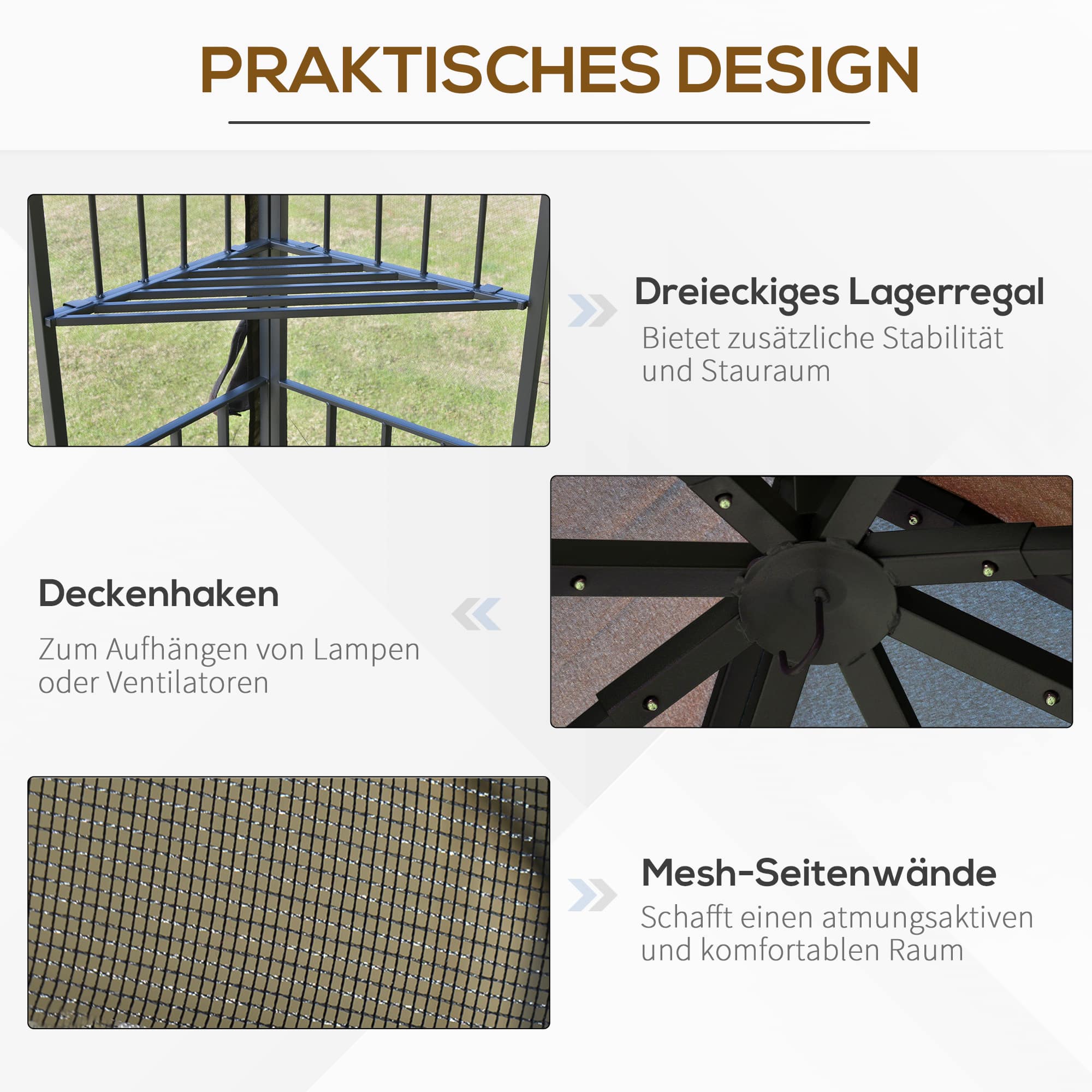 Het ruime ontwerp van het tuinpaviljoen biedt voldoende ruimte voor al uw gasten om te genieten van een gezellig samenzijn. De zijwanden zorgen voor een aangename luchtcirculatie, terwijl de insectennetten insecten op afstand houden, waardoor u ongestoord kunt genieten van uw tijd buiten. Daarnaast zijn de vier praktische hoekplanken ideaal voor het opbergen van wijnflessen, boeken of decoratieve items.