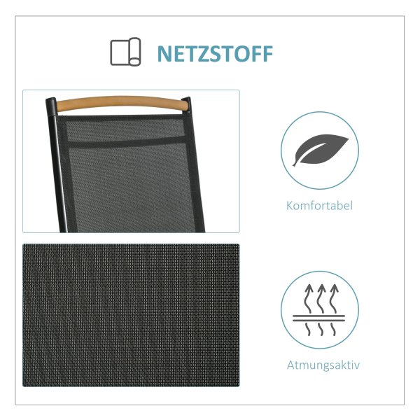 Deze tuinstoelen zijn gemaakt van aluminium, waardoor ze licht van gewicht zijn en gemakkelijk te verplaatsen. Het ademende netwerkstof zorgt voor extra comfort tijdens het zitten, terwijl de armleuningen van plastic met houten graan een warme en casual uitstraling geven.