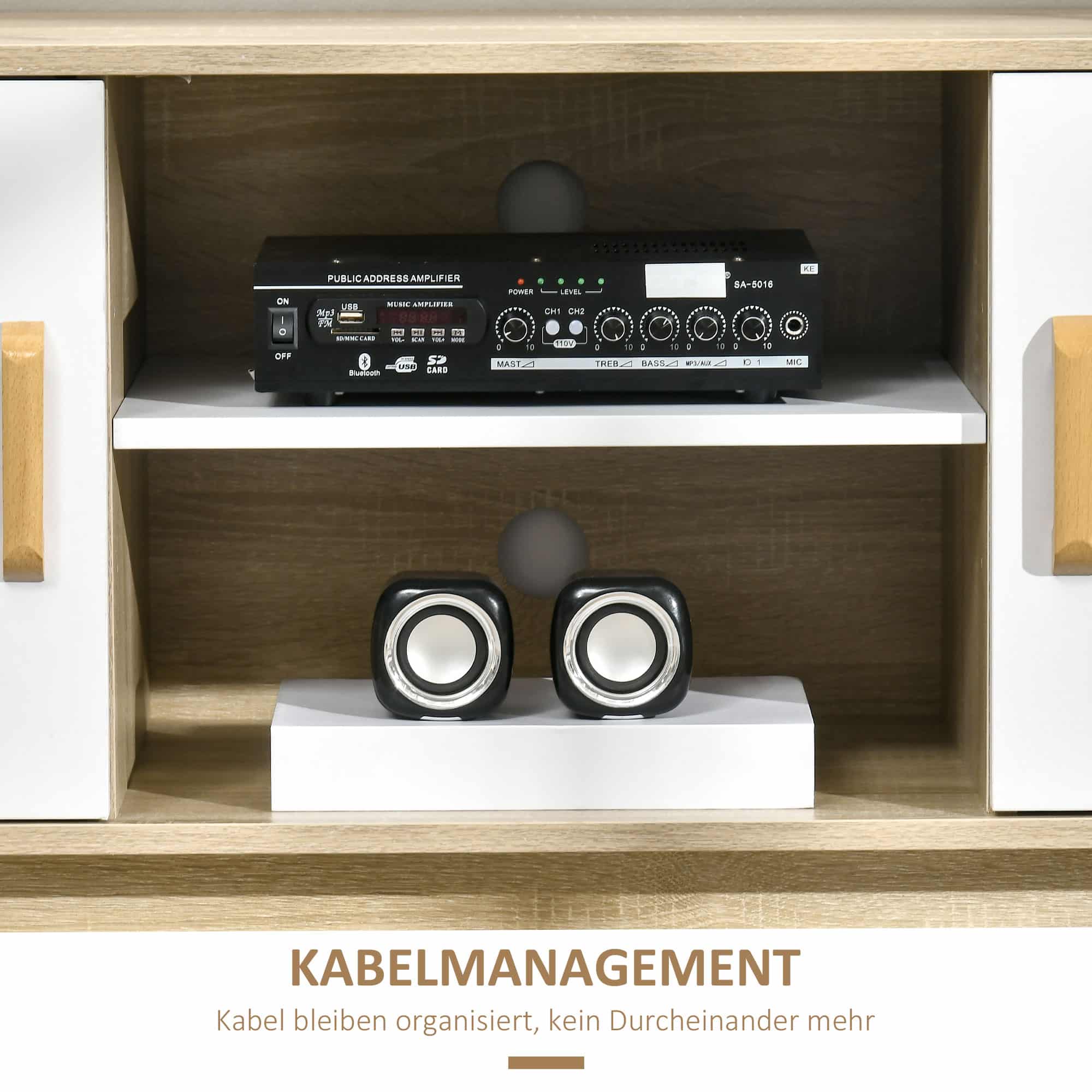 Dit tv-meubel is gemaakt van massief spaanplaat en dennenhout, waardoor het robuust en duurzaam is. De planken zijn in hoogte verstelbaar, waardoor u grote en kleine items gemakkelijk kunt opbergen. Het heeft een gewichtscapaciteit van 50 kg in totaal, wat voldoende is voor al uw mediabenodigdheden.