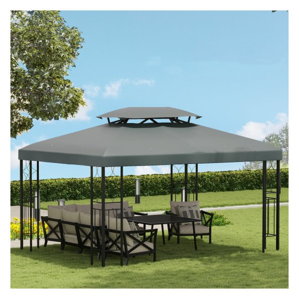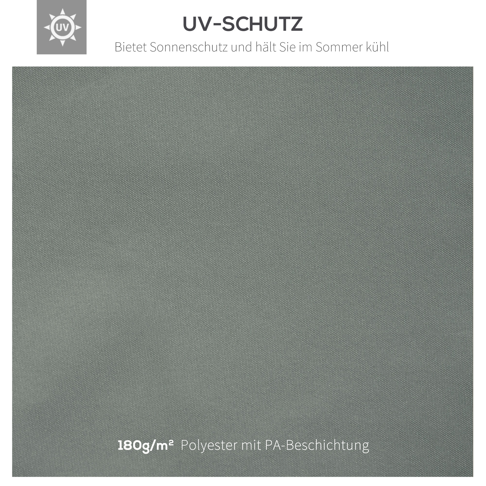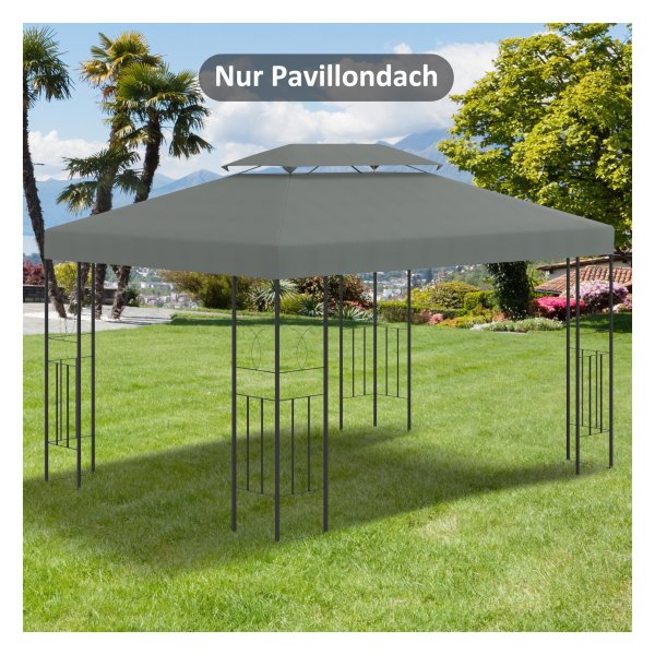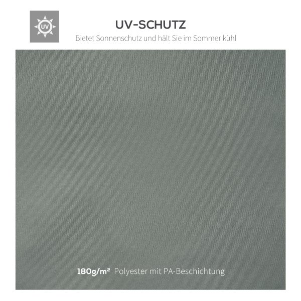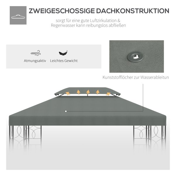 Met een basisoppervlak van 4 x 3 meter biedt dit tuinpaviljoen voldoende schaduw en beschermt het effectief tegen te hoog zonlicht. De 180 g/m² coating zorgt ervoor dat het dak robuust en duurzaam is, waardoor het langdurig bestand is tegen verschillende weersomstandigheden.