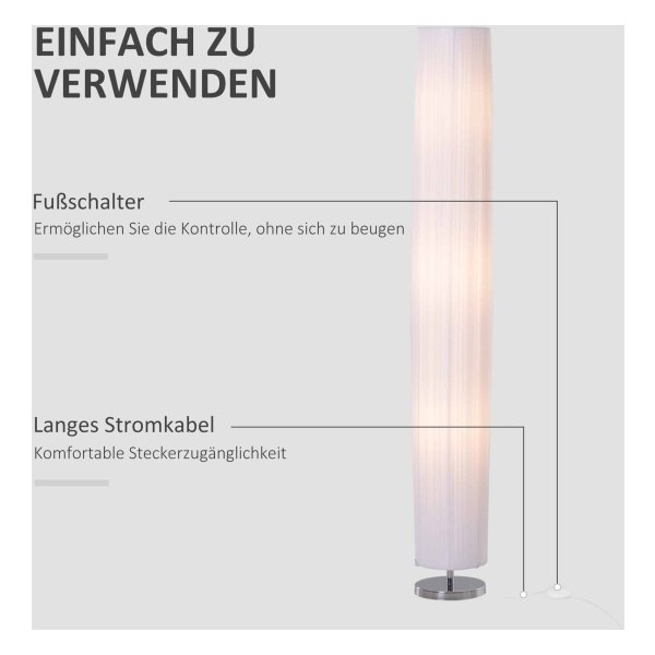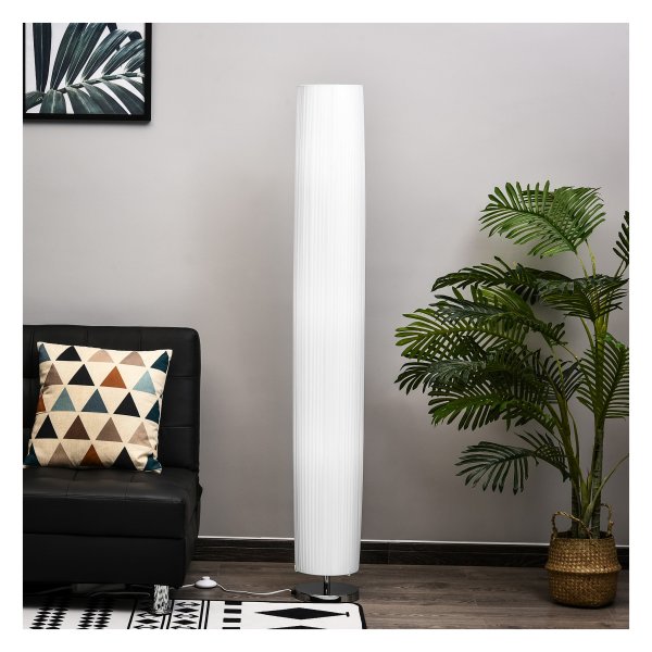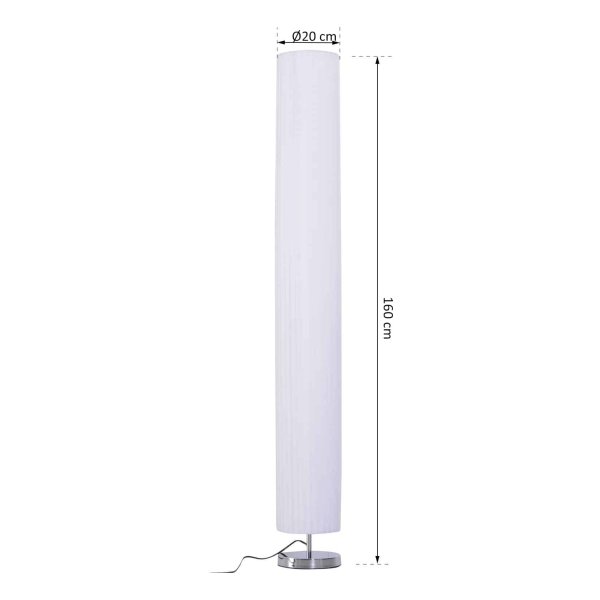 De vloerlamp is gemaakt van hoogwaardig roestvrij staal en synthetische vezels in de kleuren wit en zilver. De algemene afmetingen van de lamp zijn Ø20 x H160 cm, met een lampenkap van Ø20 x H150 cm en een lampframe van Ø20 x H138 cm. De lamp werkt op een spanning van 220-240 V/50 Hz en vereist 3 x E27 lampen tot 40 W (niet inbegrepen). De kabellengte is 1,7 m en het gewicht van de lamp is 3,75 kg.
