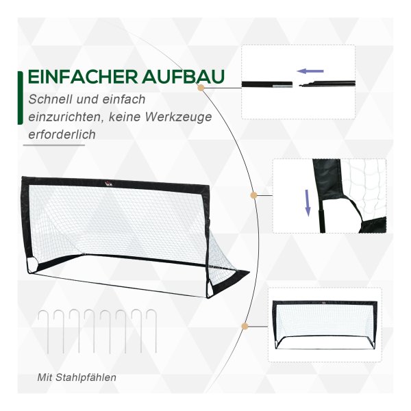 Met een totale afmeting van 186L X 90B X 89T cm zijn de voetbaldoelen perfect voor trainingen en vrijetijdsspelletjes. Elke set wordt geleverd met 2 voetbaldoelen, 8 J-type nagels, 4 fiberglass buizen en een handige opbergzak. Zo heb je alles wat je nodig hebt om direct aan de slag te gaan!