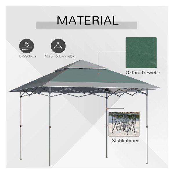 Het tuinpaviljoen is gemaakt van hoogwaardige materialen zoals stevig staal en duurzaam Oxford-stof, waardoor het bestand is tegen UV-straling en andere weersinvloeden. De opvouwbare constructie zorgt voor stabiliteit en comfort, terwijl de Central Hubhak Design het paviljoen gemakkelijk te openen maakt.