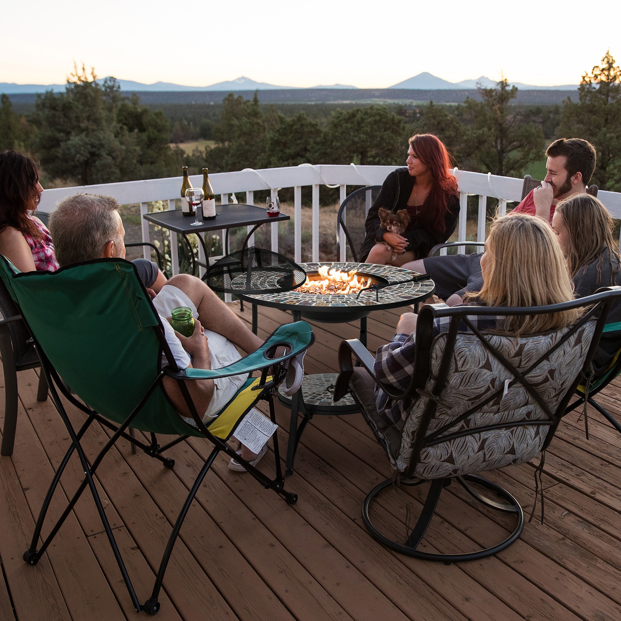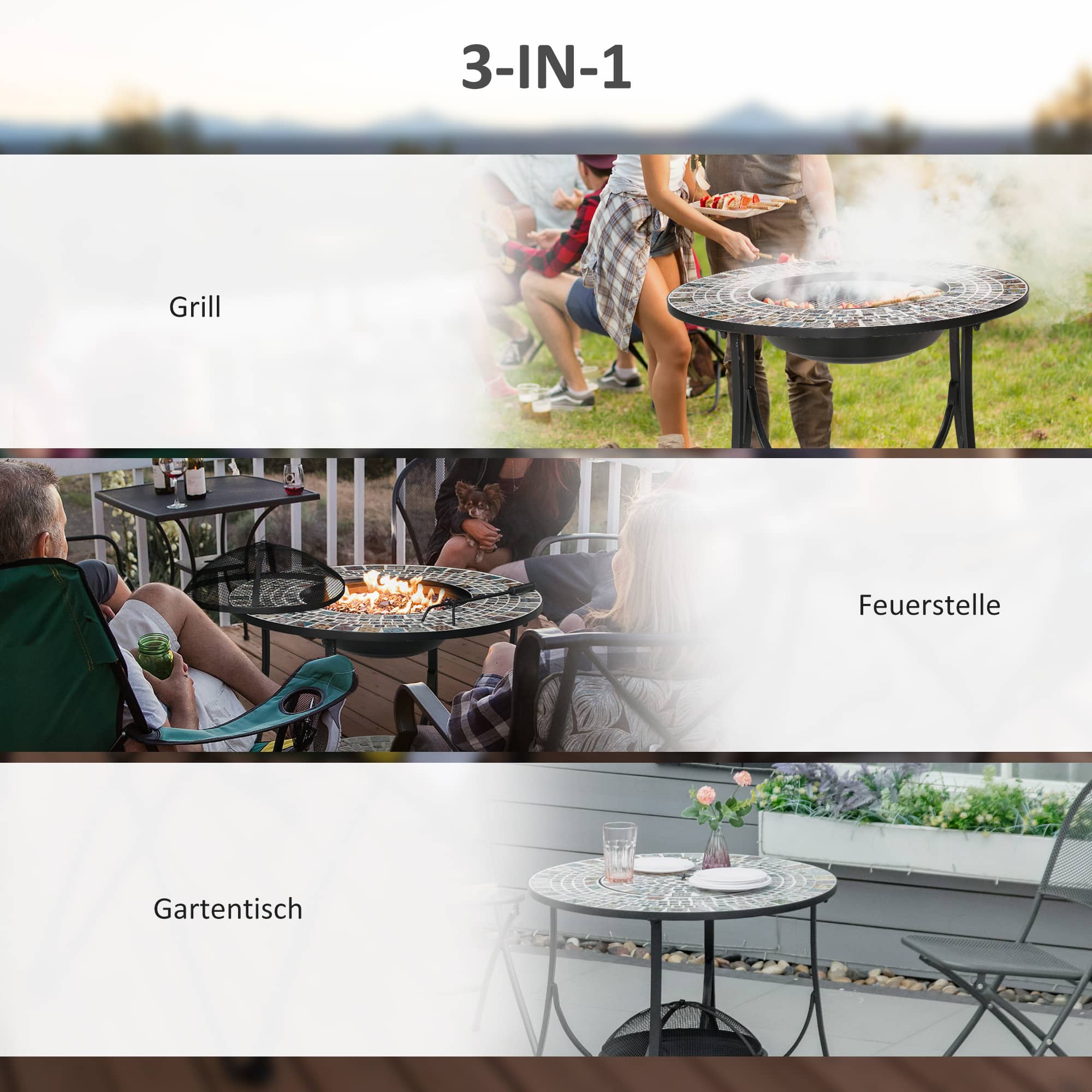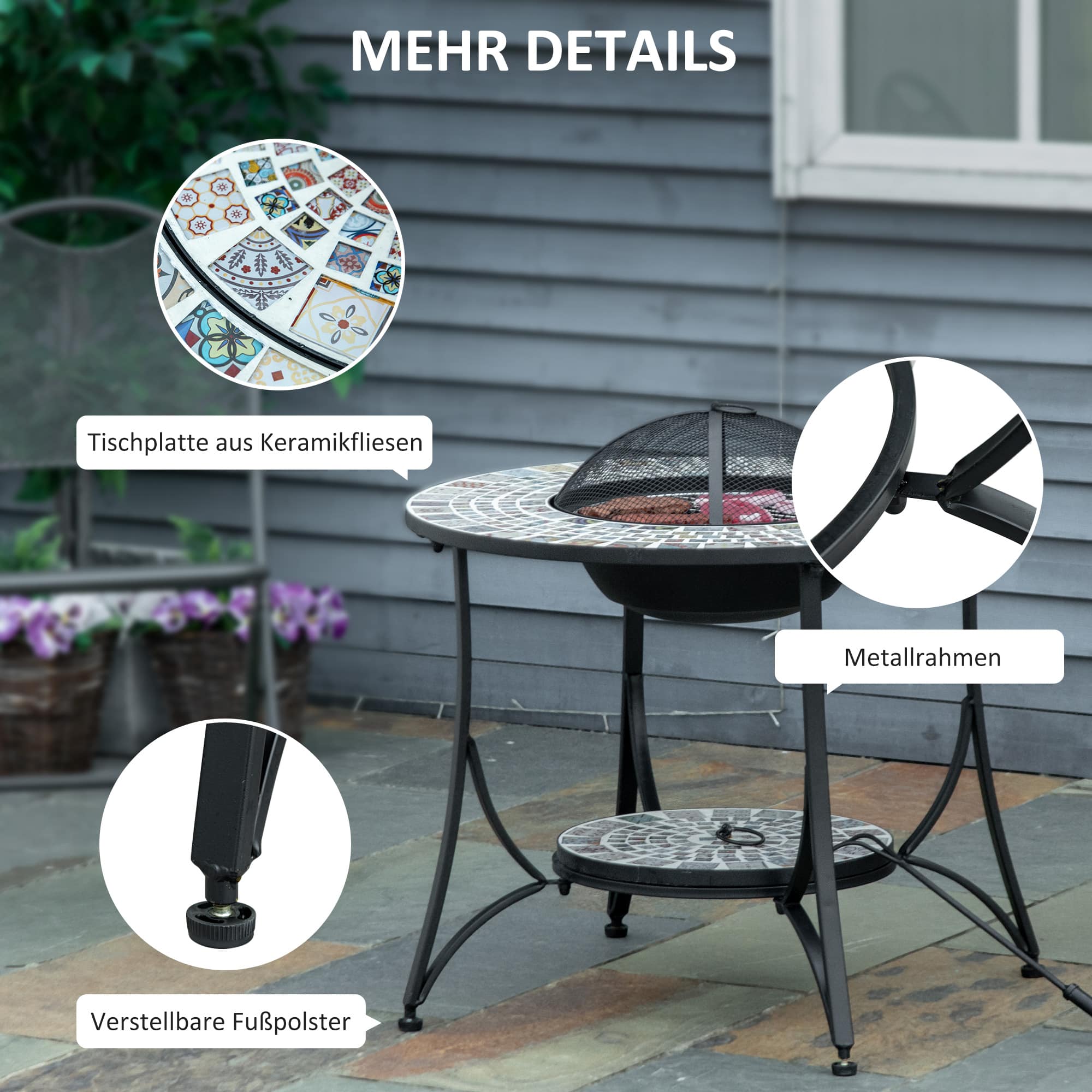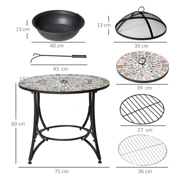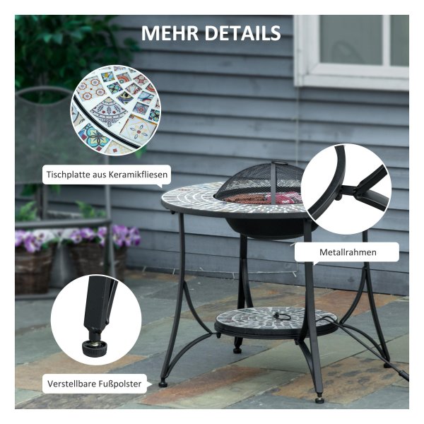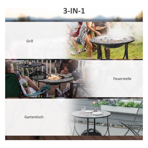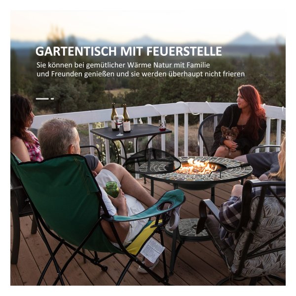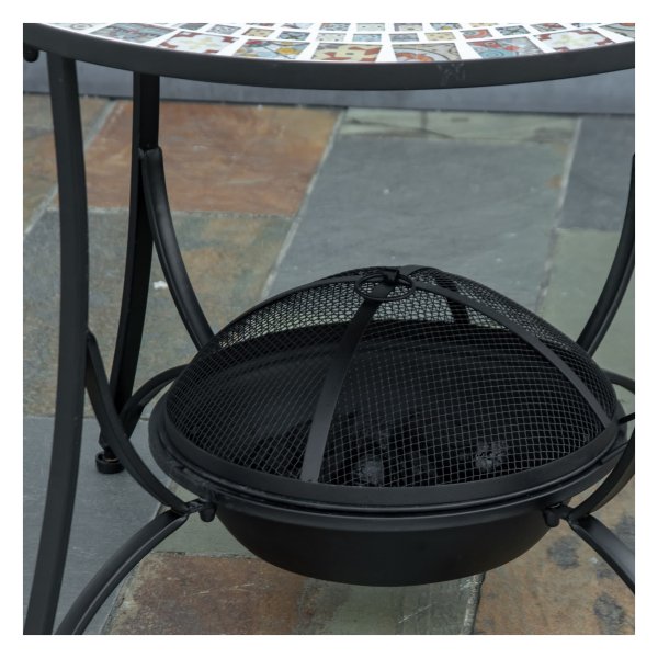 De Vuurtafel kan gebruikt worden voor warmte op koude avonden, maar ook voor het grillen van heerlijke maaltijden dankzij het meegeleverde grillrooster. Het prachtige keramisch betegelde tafelblad biedt een handige plek voor dranken en kleine objecten.